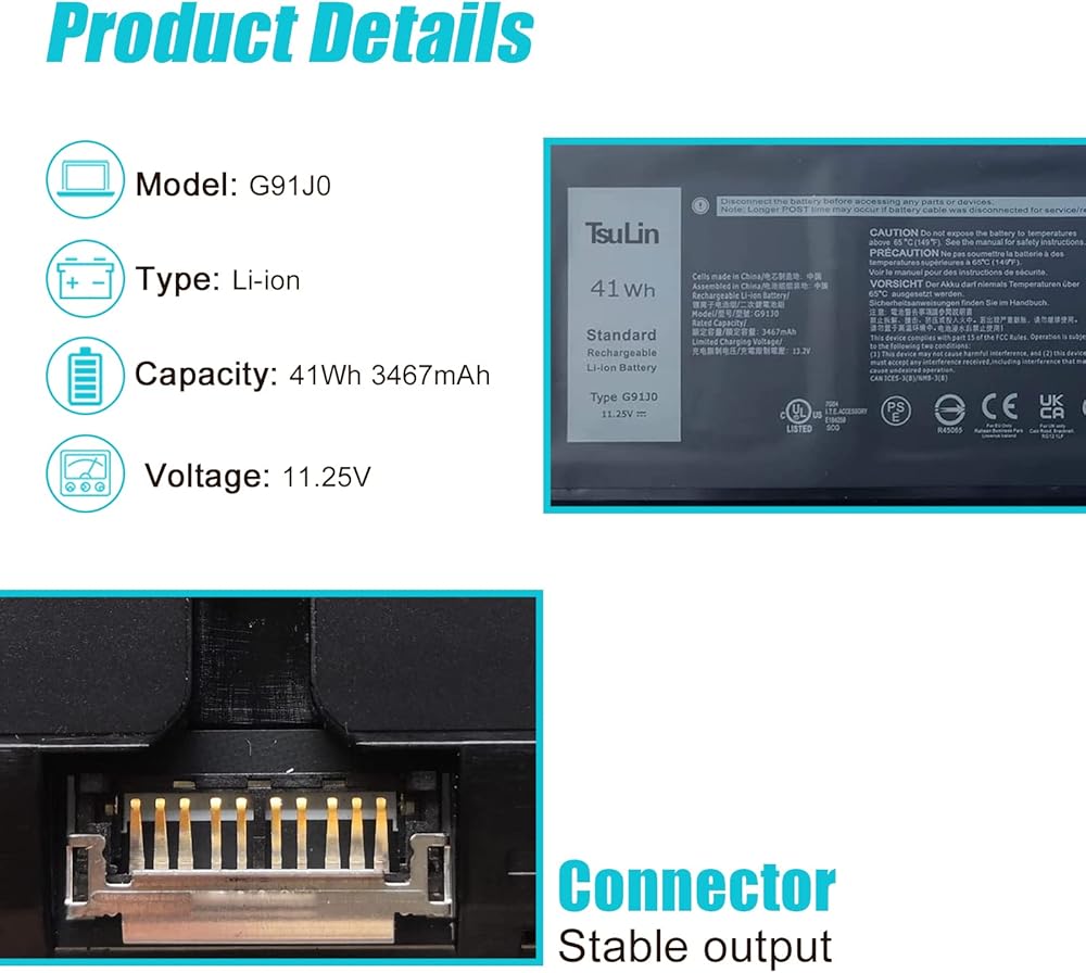 🔋【المواصفات】الموديل: G91J0؛ نوع البطارية: ليثيوم أيون؛ الجهد االكهربى: 11.25 فولت؛ السعة: 41 وات في الساعة 3467 مللي أمبير في الساعة؛ لون البطارية: أسود. الحالة: جديد تمامًا، من مواد عالية الجودة، ولوحات دوائر علوية ورقاقة ذكية.