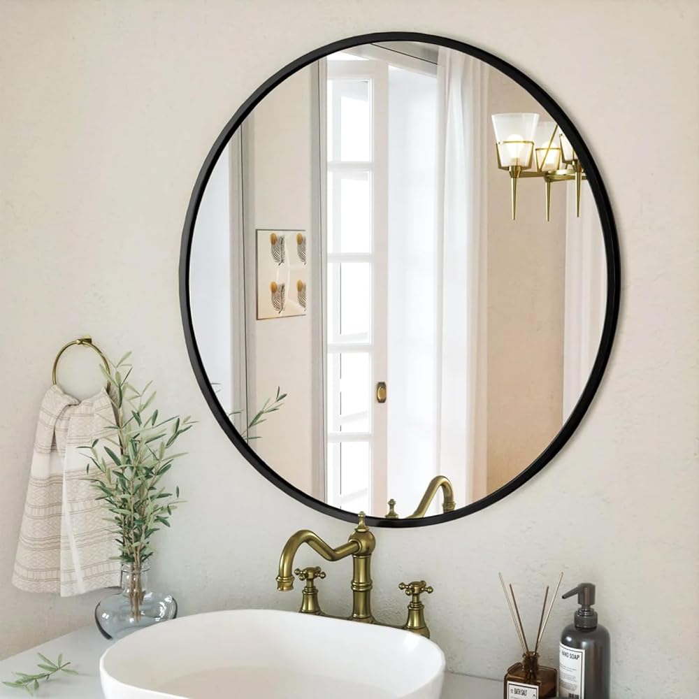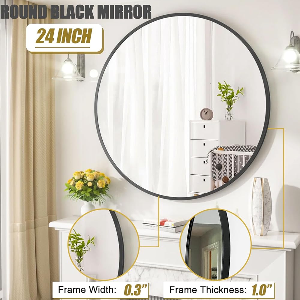 【مرآة دائرية بتصميم عصري】هذه المرآة المستديرة مقاس 24 بوصة مصنوعة بإطار معدني أنيق من سبائك الألومنيوم. تصميمها البسيط والحديث يسمح لها بمطابقة أي ديكور بسلاسة، مما يجعل المرآة الدائرية مثالية للاستخدام كمرآة حمام، أو مرآة مدخل، أو مرآة زينة، أو مرآة غرفة المعيشة.