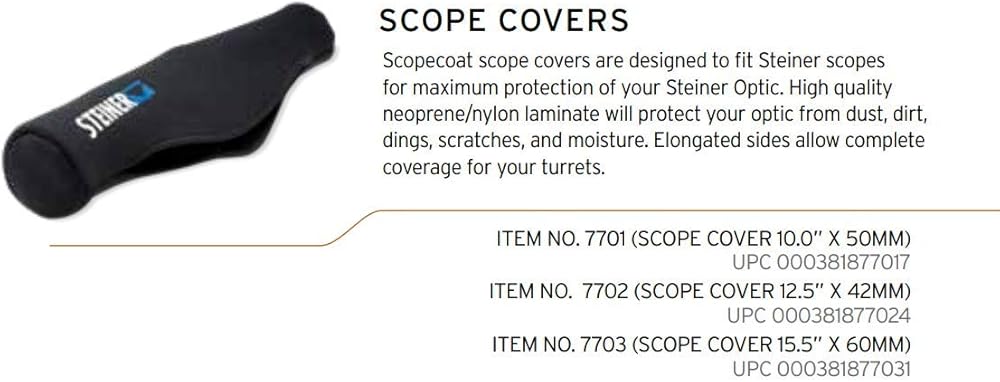 - تم تصميم أغطية نطاق Steiner من ScopeCoat لتناسب نطاقات Steiner، وتوفر أقصى قدر من الحماية لبصريات Steiner الخاصة بك