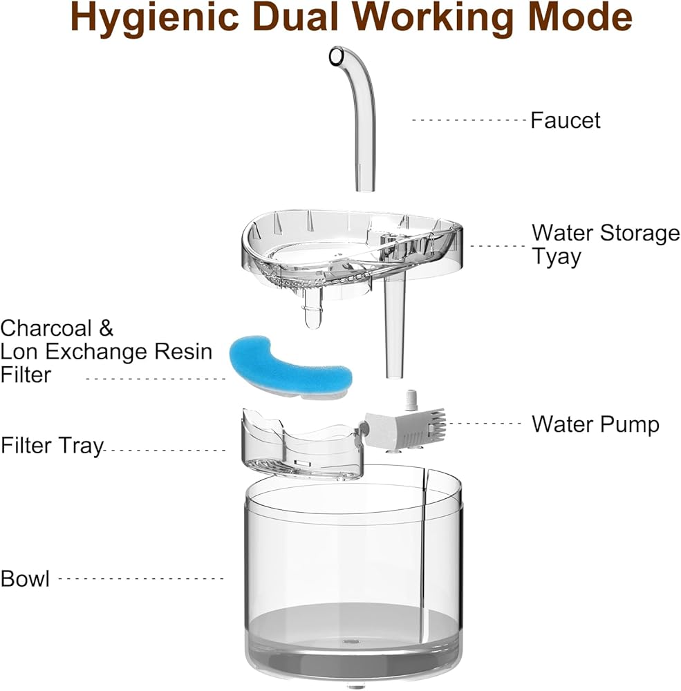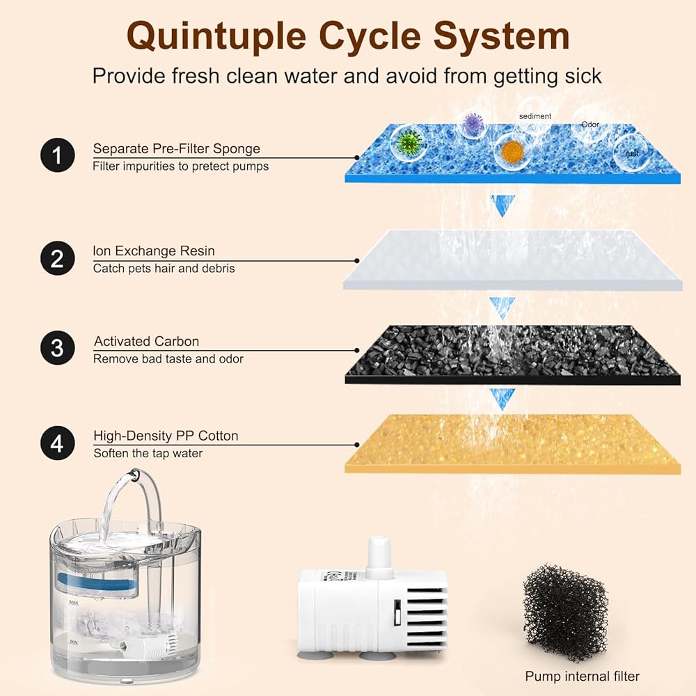 • 【أنظمة ترشيح متعددة】مصنوع من إسفنجة ما قبل الحشو، والكربون المنشط، وراتنج تبادل الحديد، وقطن البولي بروبيلين عالي الكثافة، يمكن لفلتر نافورة مياه القطط الخاص بنا تصفية الشعر والغبار والحطام بشكل فعال وامتصاص الأيونات والروائح المعدنية الثقيلة. مع نظام ترشيح متعدد، ستوفر مستلزمات التغذية والسقي للقطط والكلاب لدينا مياه شرب نظيفة وذات مذاق جيد لحيواناتك الأليفة طوال الوقت.