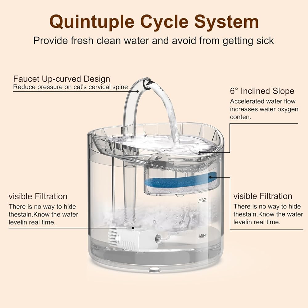 • 【تشجع على الشرب】تدفق "المياه الحية" - نافورة القطط هذه تشبه الربيع المتدفق، كل رشفة من مشروب حيوانك الأليف هي مياه عذبة! تيار السقوط يغري الحيوانات الأليفة لشرب المزيد من الماء.