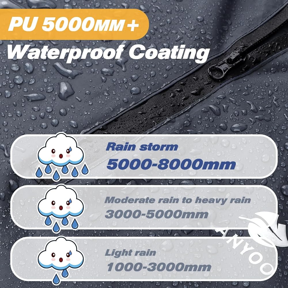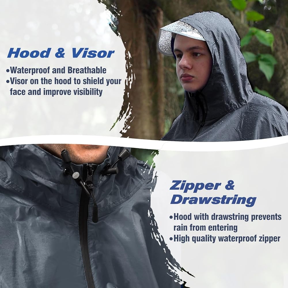 مادة مقاومة للماء وقوية: معطف المطر مصنوع من نسيج بوليستر عالي الكثافة 190T + طلاء من البولي فينيل كلوريد. لتعزيز قدرات مقاومة الماء لمعطف المطر، نستخدم شريط إغلاق مخيط لضمان عدم تسرب الماء عبر الدرزات. سحاب عالي الجودة مقاوم للماء على خط الرقبة مع درزات مبطنة أفضل من السحابات الأخرى، فهو يساعدك بفعالية على منع تغلغل المطر.