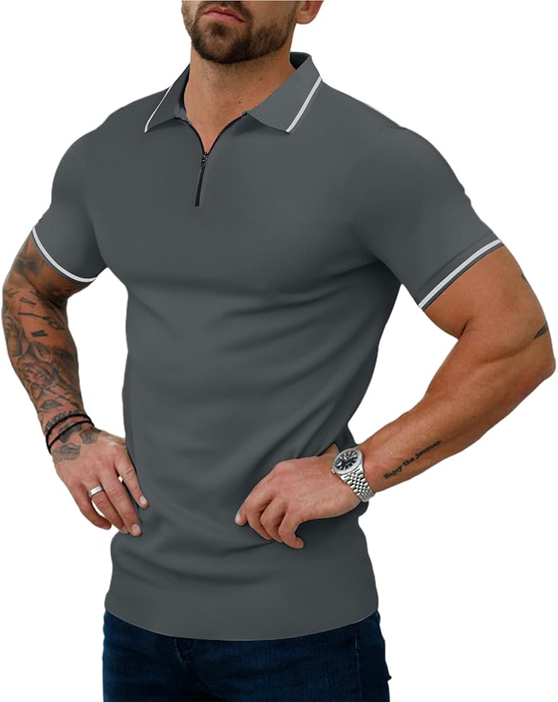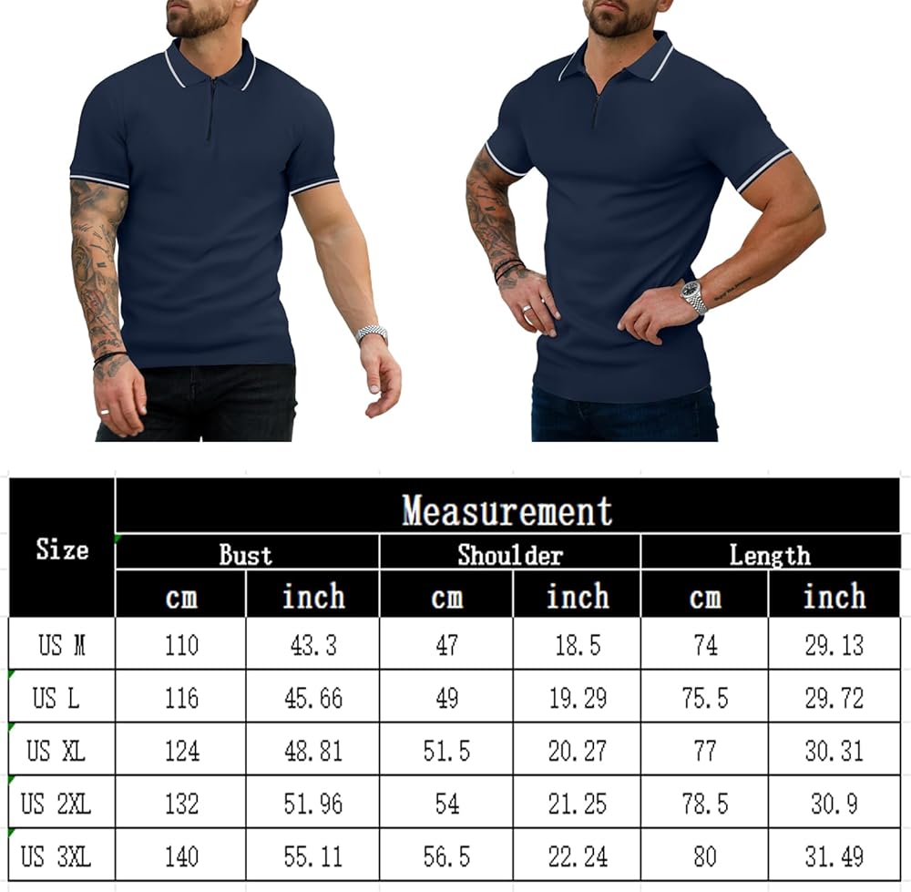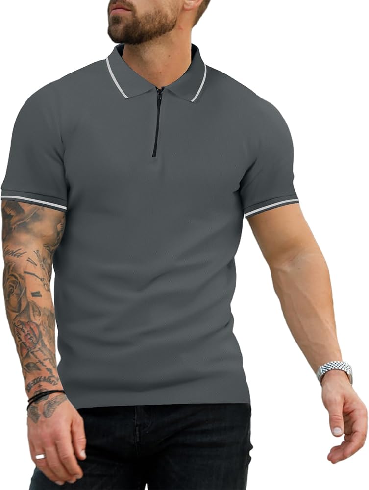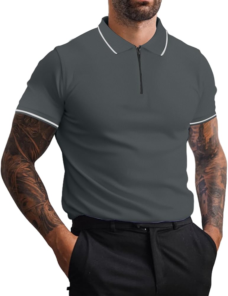 قمصان بولو كاجوال: قميص بولو رجالي مصمم بسحاب 1/4 رقيق، مقاس نحيف، قميص قصير، لون ثابت، ياقة مطوية، أساور أكمام ذات أربطة مرنة عالية يمكن أن تجعلك تشعر بالأناقة والعصرية.