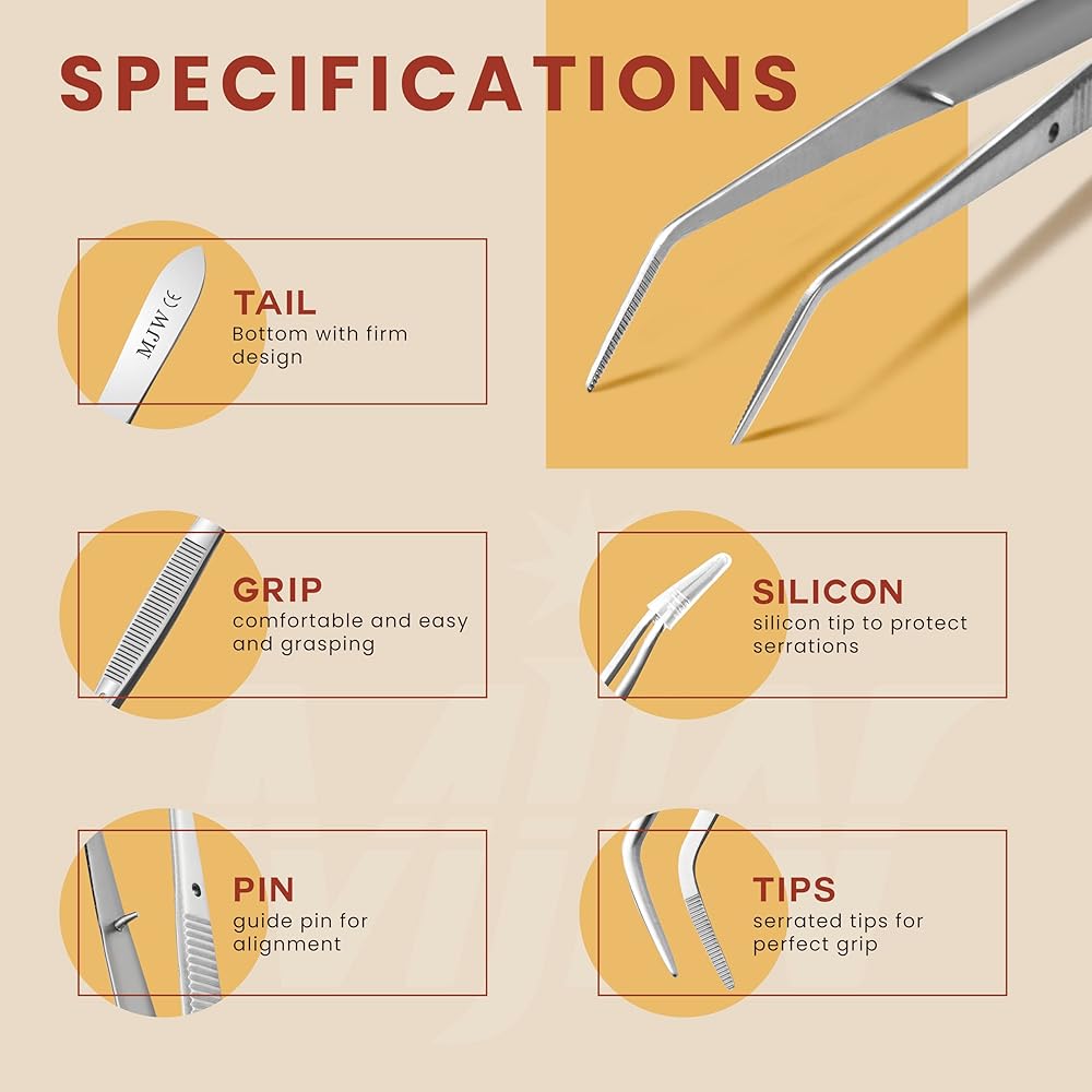• التحكم في نصائحك: مع طرف مسنن خصيصًا، توفر هذه الملاقط ذات الزوايا للخرز قبضة ثابتة وآمنة. إنها تضمن الدقة عند التقاط الأشياء الصغيرة، ويضمن دبوس المحاذاة المحاذاة الصحيحة والمتسقة لأطراف الملقط أثناء الاستخدام.