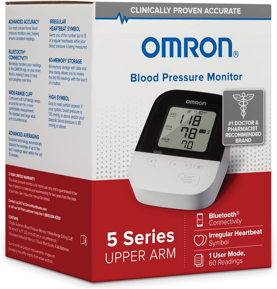 يتضمن جميع ميزات Omron الحصرية لشاشتنا من السلسلة 5 (موديل BP7200)، ولكنه يوفر اتصال Bluetooth مع تطبيق Omron Connect المجاني، مما يوفر ذاكرة غير محدودة؛ يعمل أيضًا مع الأجهزة التي تدعم Alexa باستخدام مهارة Omron Health