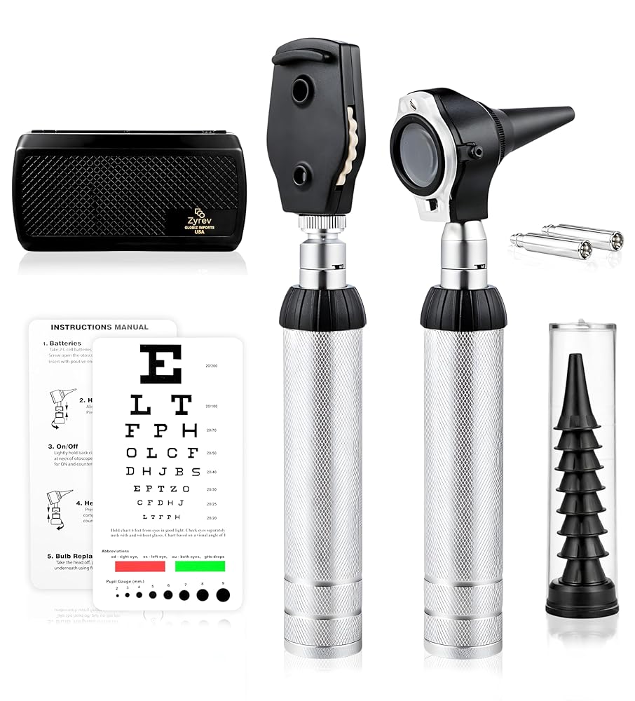مجموعة Zyrev Otscope Oph متعددة الوظائف - منظار الأذن/منظار العين لفحص الأذن والعين - مع حقيبة حمل محمولة، مخطط رؤية، نصائح بديلة (أسود)
