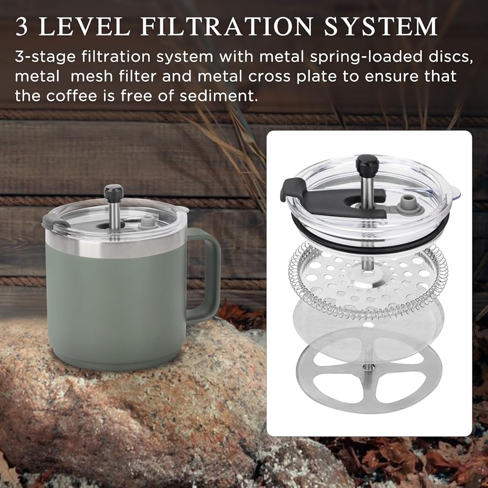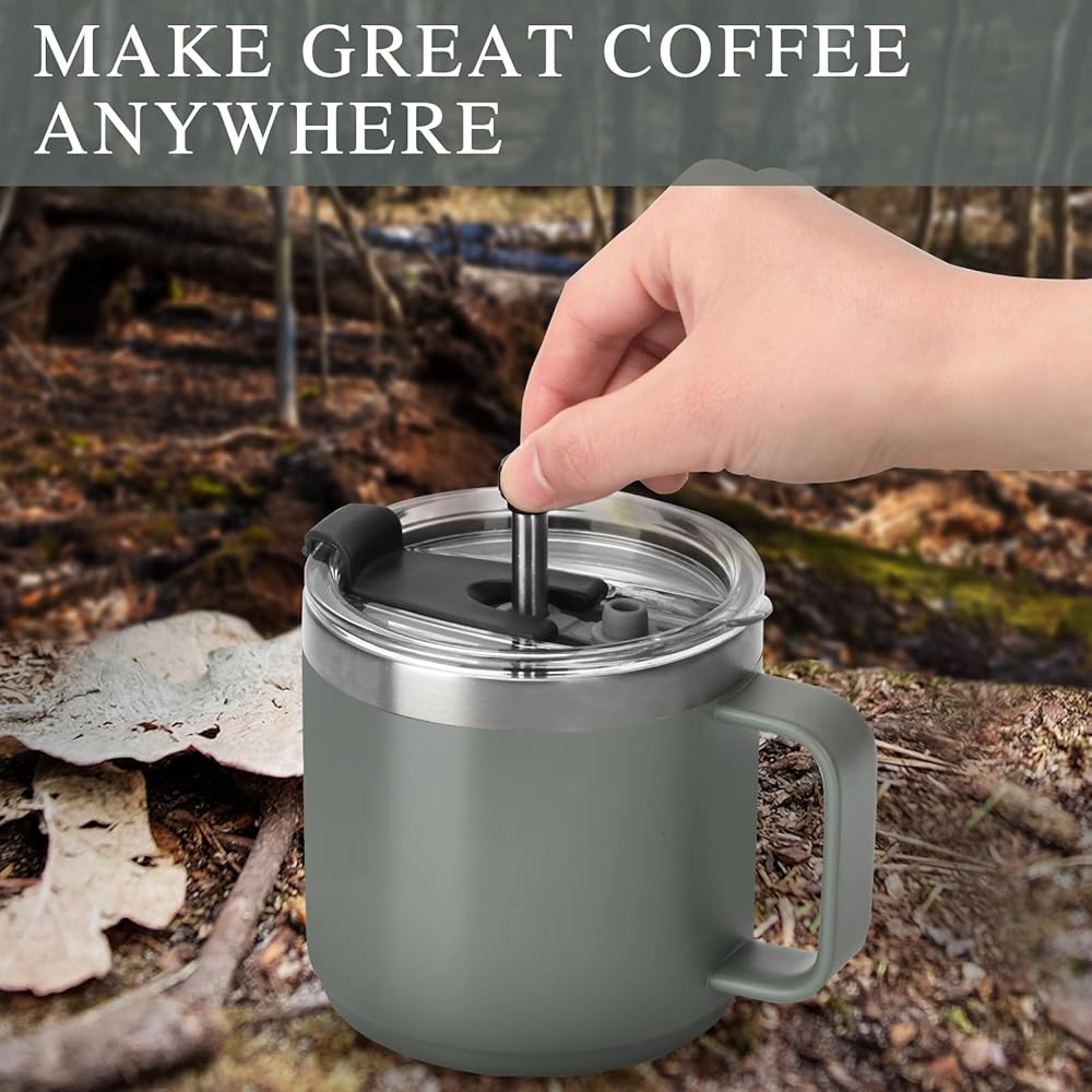 ماكينة صنع القهوة المريحة للسفر: سهلة التخزين، وسهلة الاستخدام، وسهلة التنظيف. هذا كل ما تحتاجه لتحضير كوب رائع من القهوة باستخدام كوبك المفضل. ببساطة قم بتحضير قهوتك كما تفعل مع أي ماكينة ضغط فرنسية، واشربها مباشرة من غطاء الشرب المصمم خصيصًا.