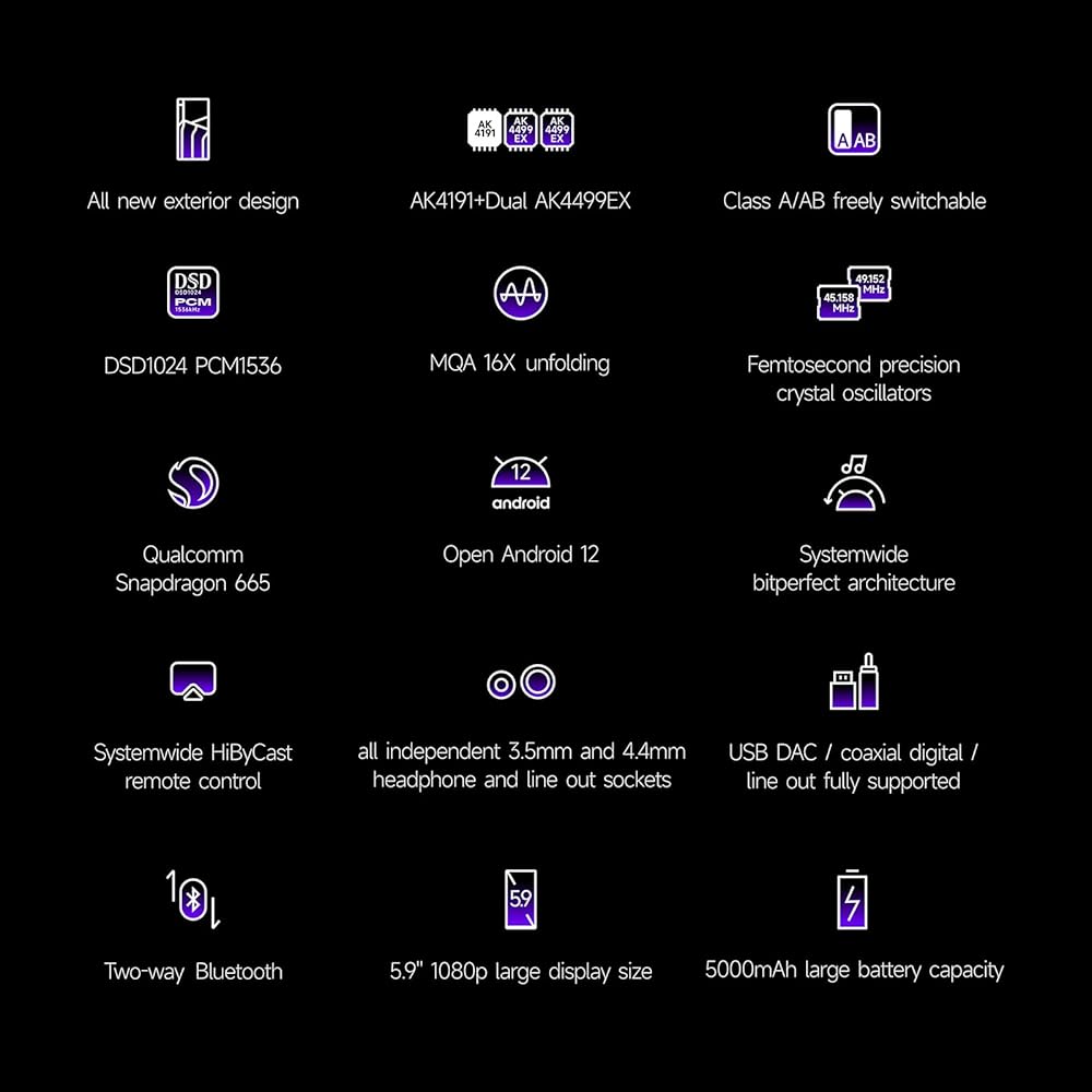 • مدعومًا بمعالج Qualcomm Snapdragon 665، يعمل مشغل الموسيقى هذا على نظام التشغيل Android 12 مع ذاكرة وصول عشوائي (RAM) سعة 4 جيجابايت ومساحة تخزين 64 جيجابايت (قابلة للتوسيع حتى 2 تيرابايت). إنه يوفر تشغيلًا سلسًا وأداءً سلسًا على منصات الموسيقى المتدفقة السائدة. فهو يتجاوز تحويل معدل عينة النظام (SRC) على مستوى العالم، مما يسمح لتطبيقات الطرف الثالث بالاستمتاع بالموسيقى ذات معدل البت العالي دون فقدان. يدعم هذا المشغل أيضًا تنزيل وتثبيت تطبيقات الطرف الثالث.