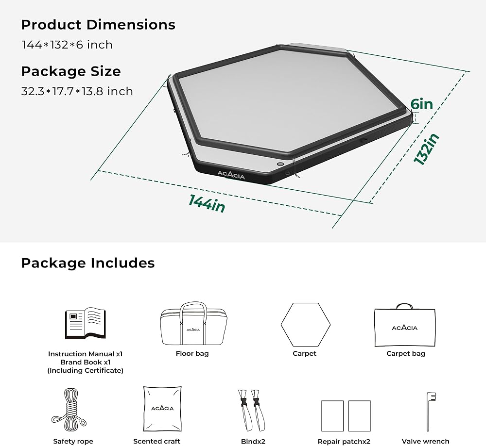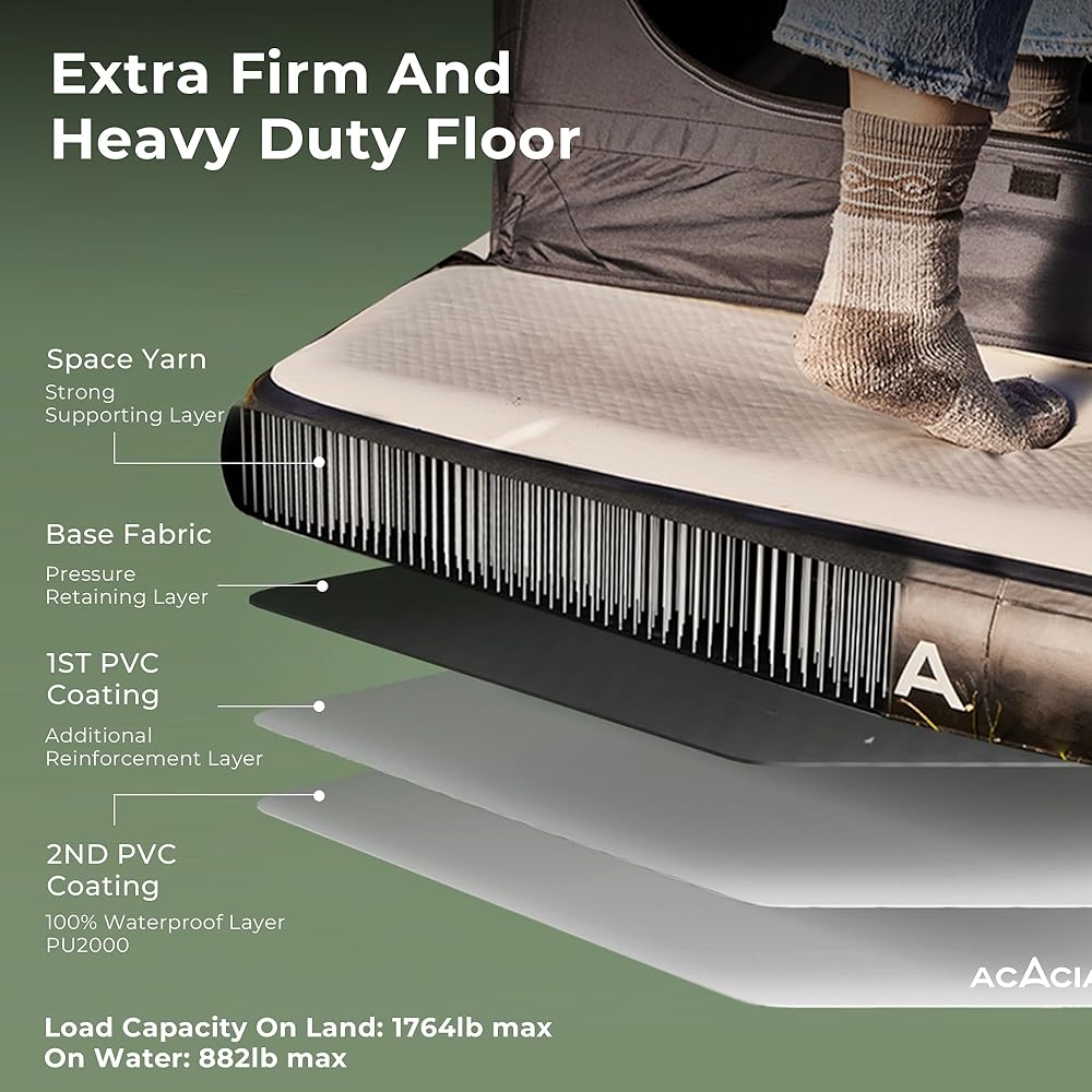 راحة فائقة: تأتي أرضية أكاسيا الفضائية المتينة بسُمك 15.24 سم مع سجادة ناعمة قابلة للإزالة، وتوفر راحة فاخرة على أي تضاريس من العشب والحصى إلى الجذور والصخور. لا مزيد من النوم على الأرض.