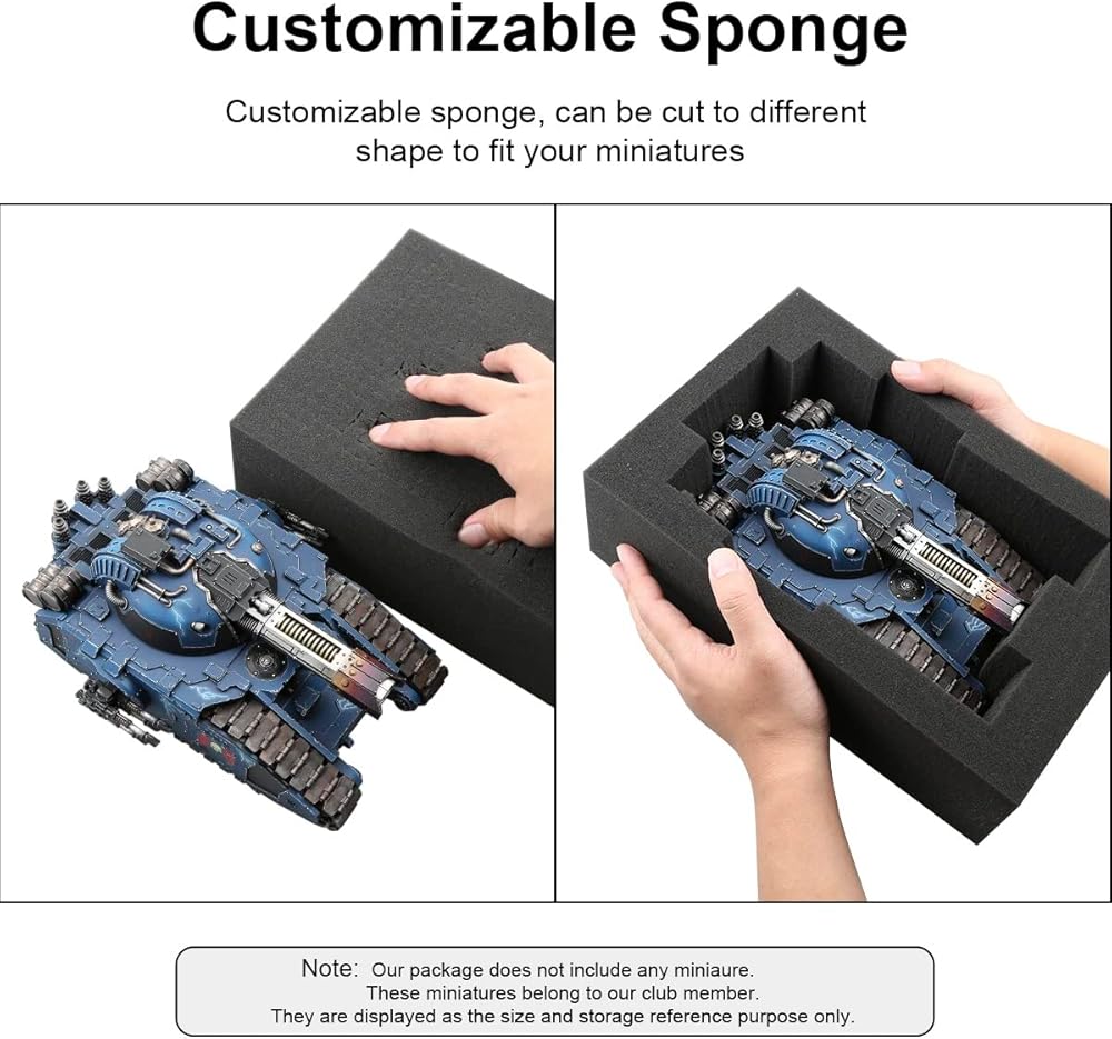 • 【إسفنج قابل للتخصيص 10 سم 】تتضمن حقيبة التخزين المصغرة هذه قطعة واحدة من صينية إسفنجية سميكة مقاس 4 بوصات (10 سم). هذه الصواني الإسفنجية السميكة متوافقة مع المنمنمات ذات الحجم الكبير جدًا. سوف تسمح لك بتخزين نموذج مصغر كبير الحجم بالداخل.