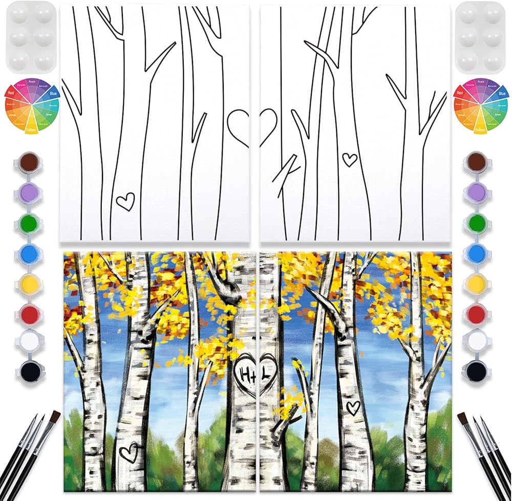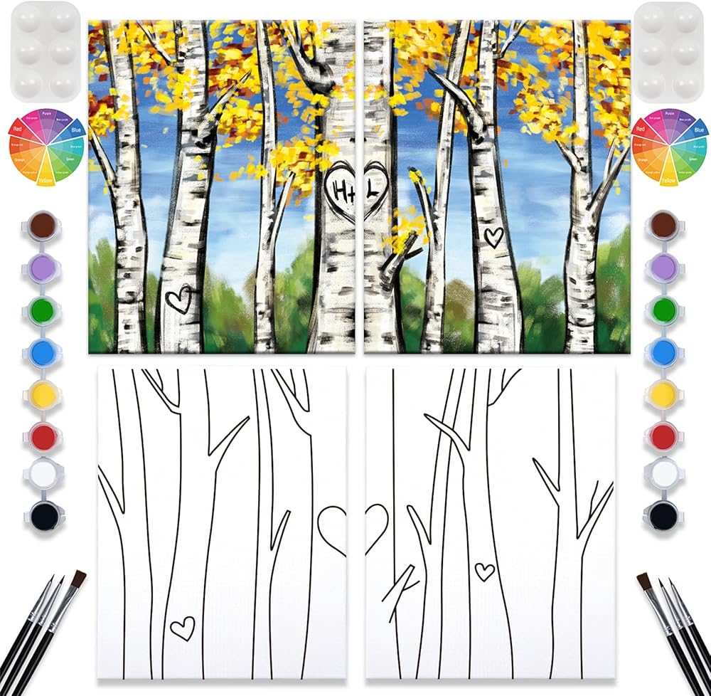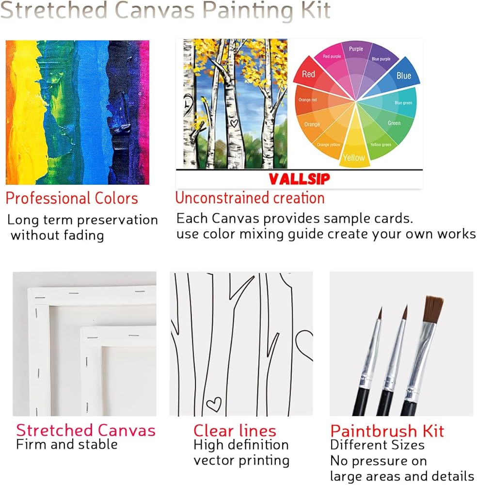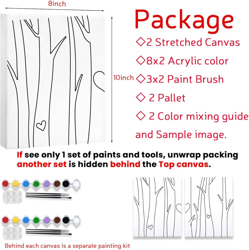 • محتويات العبوة مرتين: 8 × 10 قماش ممتد مرسوم مسبقًا؛ 8 ألوان أكريليك، 3 فرشاة طلاء، لوحة ألوان، دليل خلط الألوان وصورة عينة. يتم وضعها خلف كل قماش على حدة.