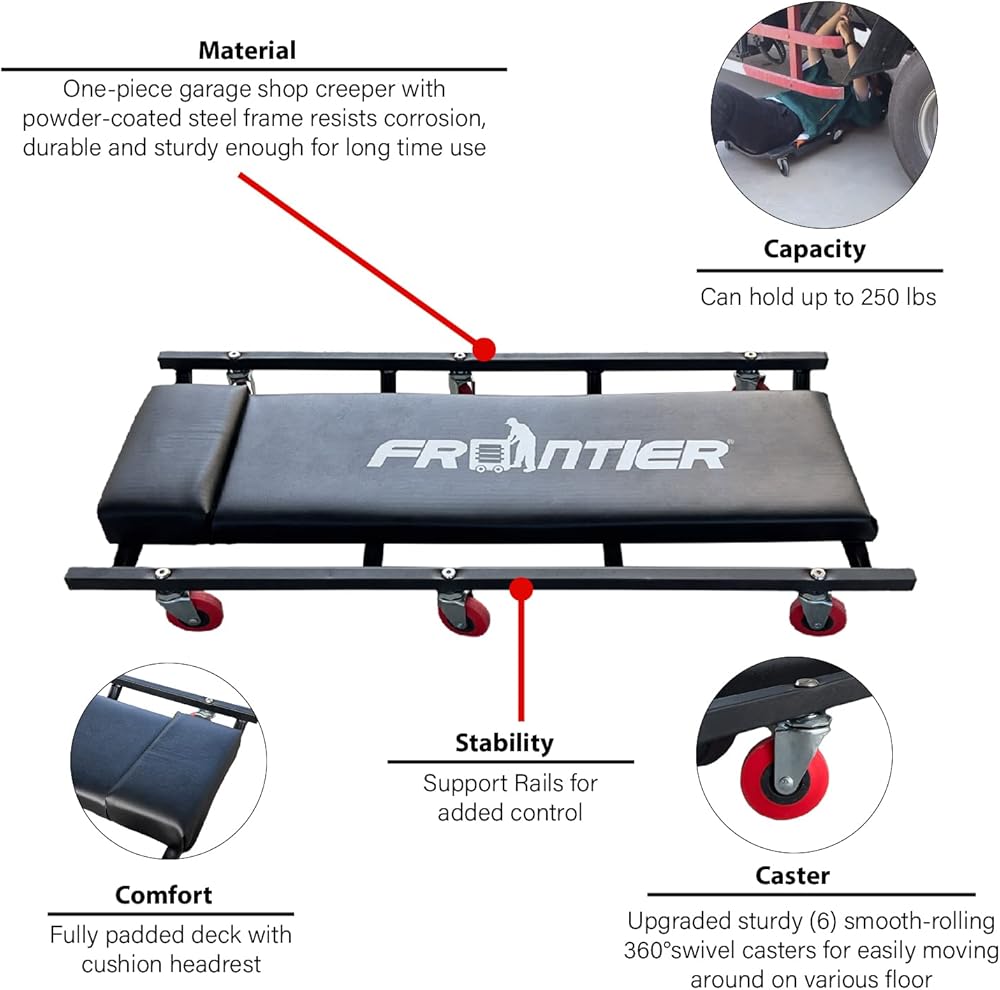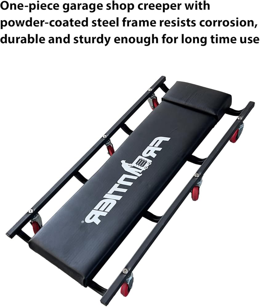 • 【زاحف متجر المرآب عالي التحمل】: زاحف متجر المرآب المكون من قطعة واحدة مع هيكل فولاذي متين يقاوم التآكل، متين وقوي بما يكفي للاستخدام لفترة طويلة، هذه العربة الميكانيكية مستقرة ومتينة بما يكفي لدعم وزن يصل إلى 250 رطلاً.