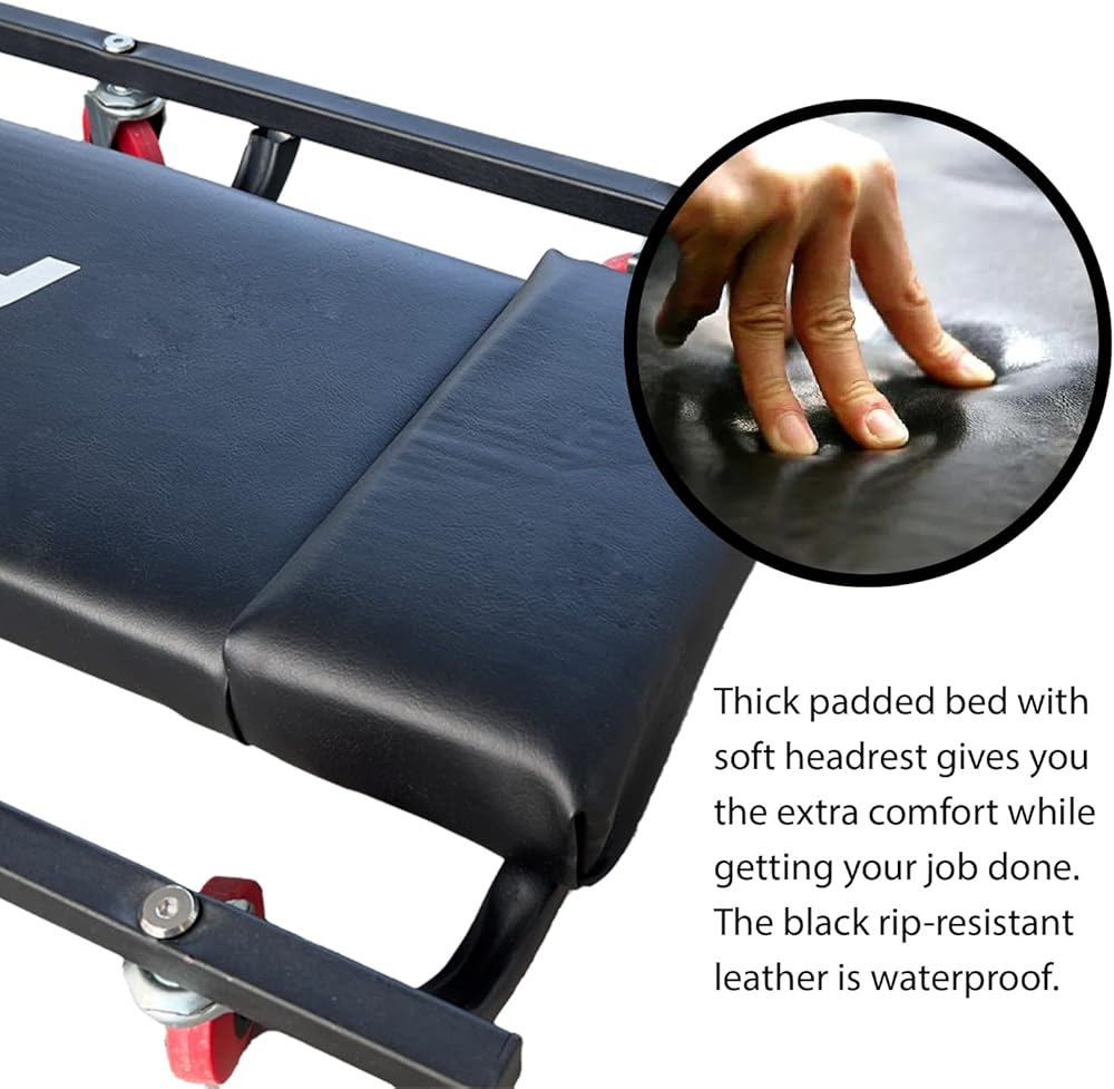 • 【زاحف المرآب المتدحرج المبطن】: تم تجهيز زاحف متجر المرآب هذا للميكانيكي بمسند رأس ناعم ومقعد مبطن بالكامل لظهرك، مما يخلق قاعدة مريحة لسهولة الوصول والحركة أثناء أعمال الصيانة الخاصة بك. يمنحك راحة إضافية للعمل في المرآب وورش العمل والسيارة والشاحنة وسيارات الدفع الرباعي والشاحنة والمزيد. الجلد الأسود المقاوم للتمزق مقاوم للماء.