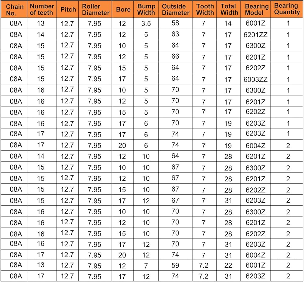 1- محتويات العبوة - تتضمن الحزمة ضرسًا مسننًا معرفًا مقاس 12 مم × 58 مم OD مع 13 سنًا ومحملًا فرديًا. تستخدم لسلاسل ISO 08A