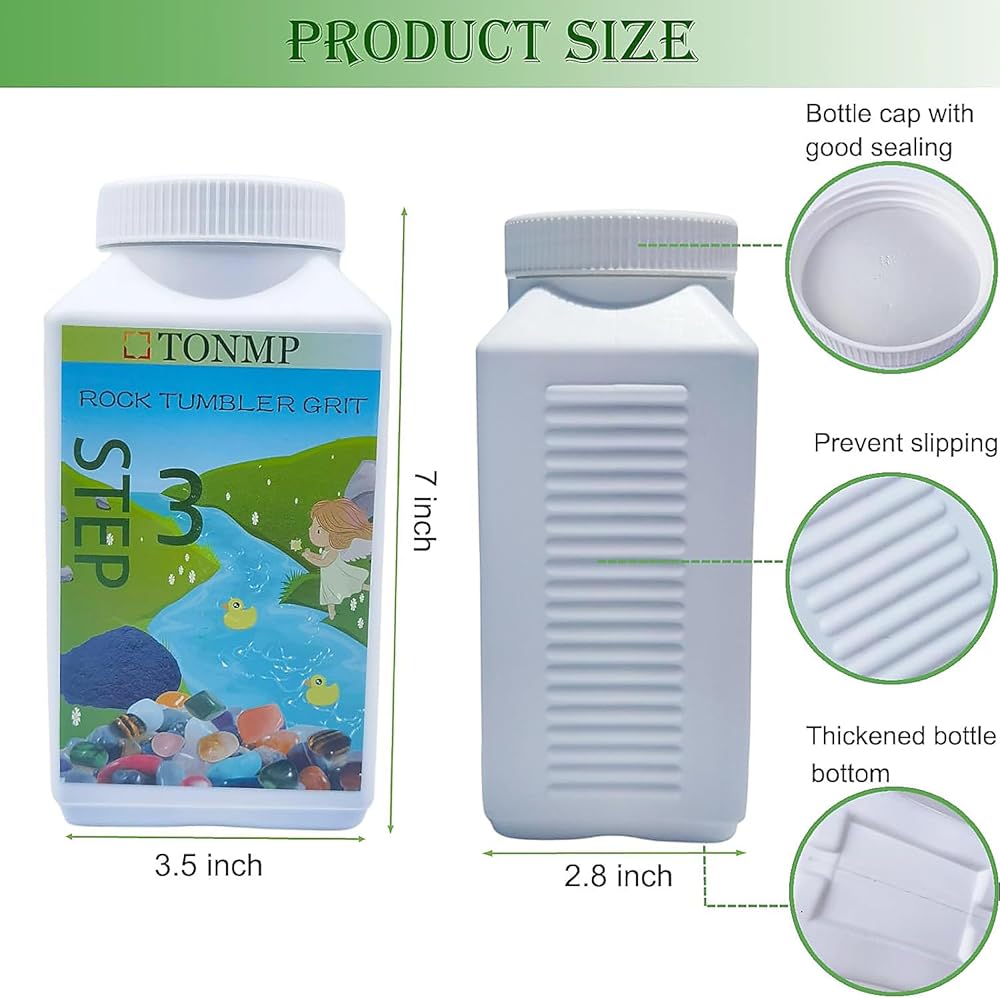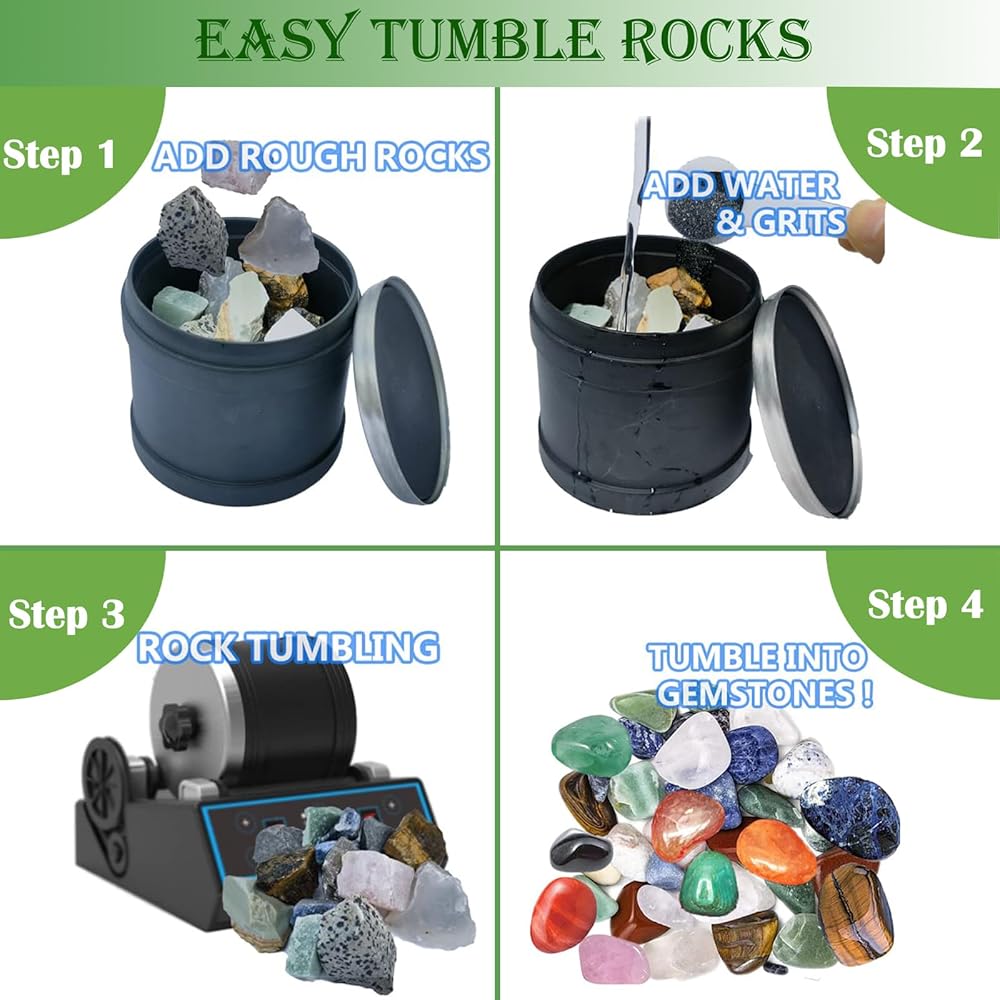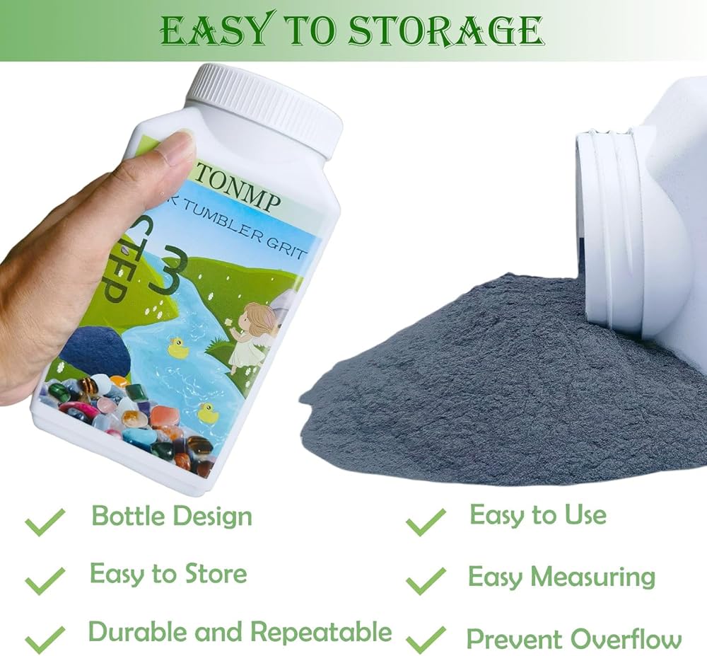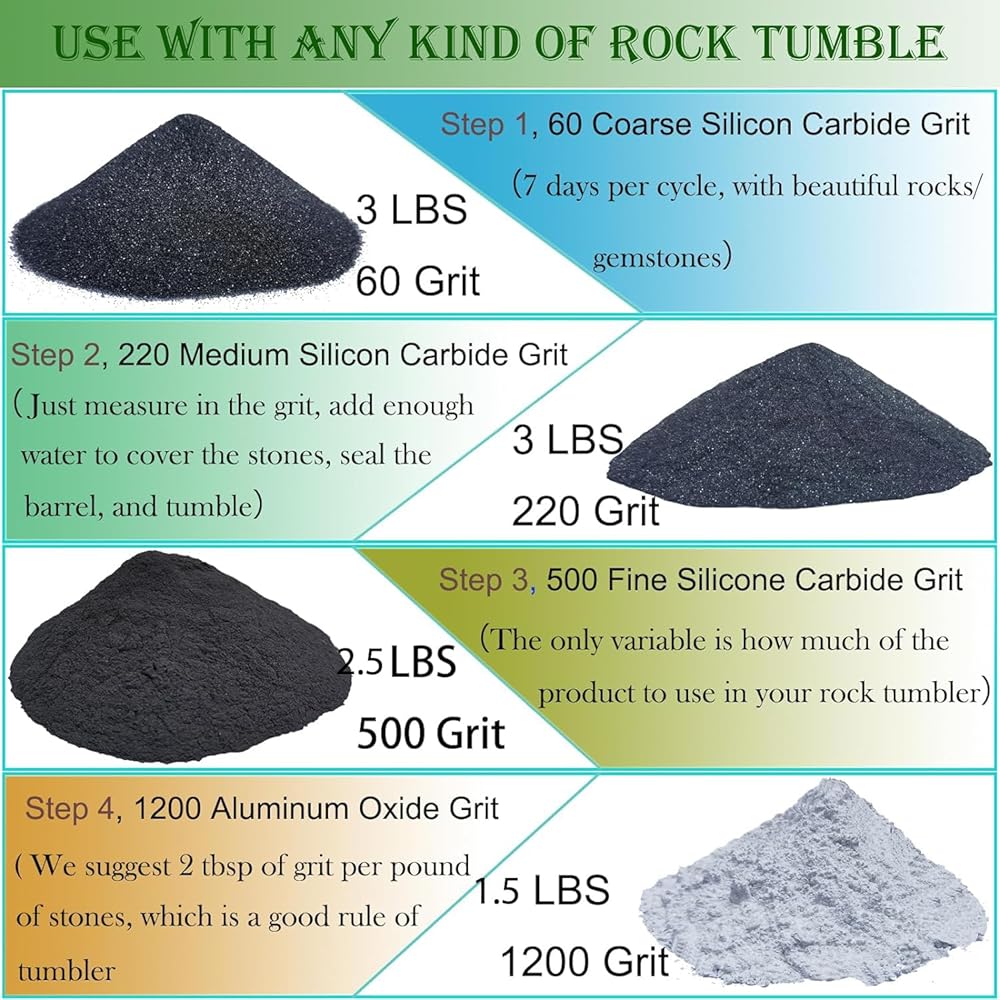• 【4 خطوات】التحلي بالصبر. هناك 4 دورات إجمالية، كل منها 7 أيام للحصول على صخور/أحجار كريمة جميلة. الخطوة 1، 60 حبيبات كربيد السيليكون الخشنة. الخطوة 2، 220 حبيبات كربيد السيليكون المتوسطة. الخطوة 3، 500 حبيبة من كربيد السيليكون الناعم. الخطوة 4، 1200 حبيبات من أكسيد الألومنيوم. فقط قم بقياس الحبيبات، وأضف ما يكفي من الماء لتغطية الحجارة، وإغلاق البرميل، ثم تجفيفه. المتغير الوحيد هو مقدار المنتج الذي يجب استخدامه في بهلوان الصخور الخاص بك. نقترح إضافة ملعقتين كبيرتين من الحبيبات لكل رطل من الحجارة، وهي قاعدة جيدة.