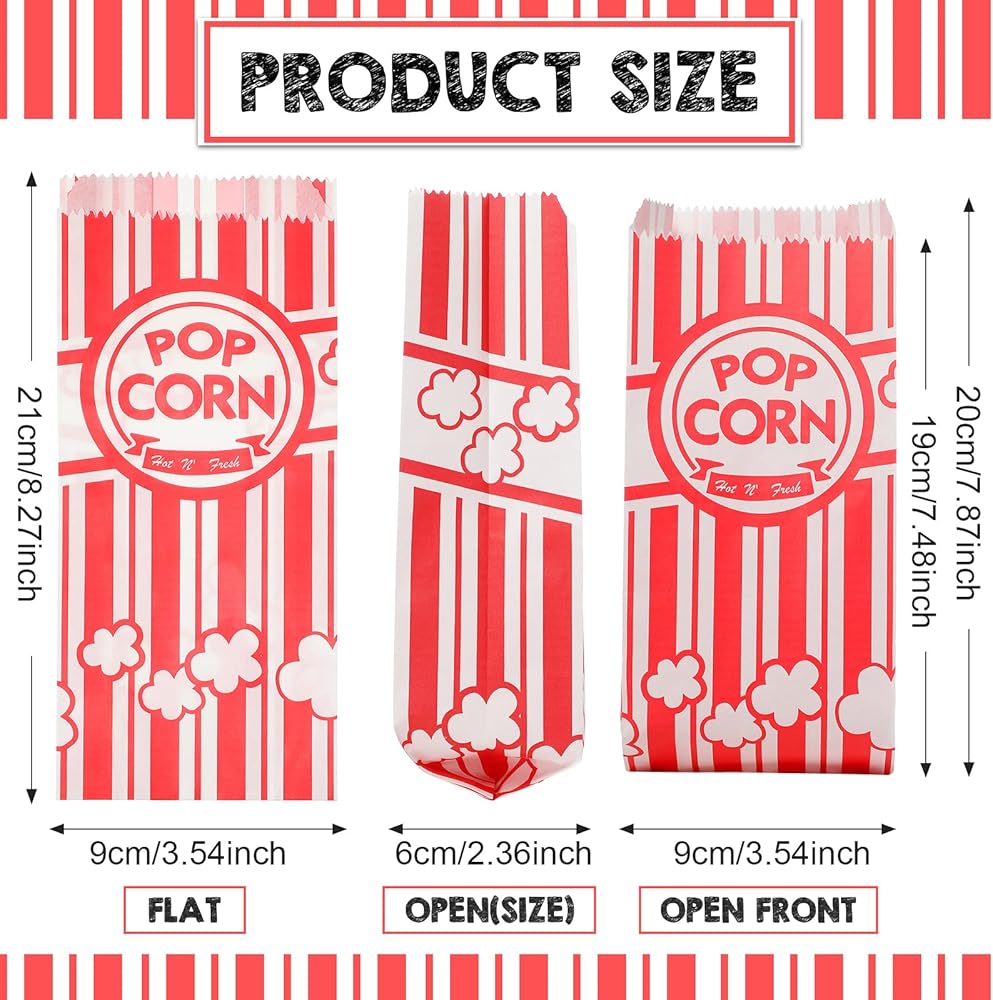 • حجم مناسب يناسب معظم الأماكن: يبلغ مقاس كل كيس فشار ورقي حوالي 9 × 6 × 21 سم/ 3.54 × 2.36 × 8.27 بوصة، الحجم المتوسط ​​يمكن أن يناسب معظم الأماكن، ويسمح لك بالاستخدام بشكل مريح، ويمكن أن تترك حقيبة الفشار المخططة ذاكرة جيدة للضيوف