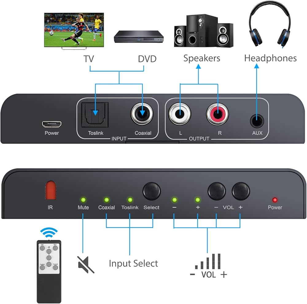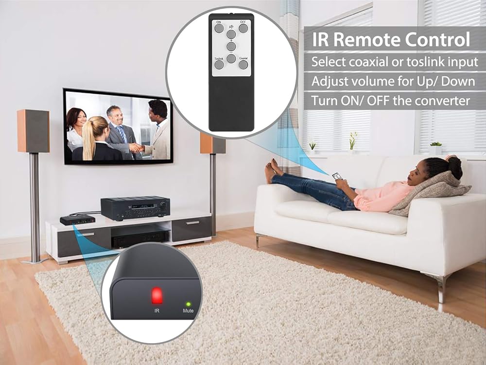 محول LiNKFOR DAC مع جهاز تحكم عن بعد 192 كيلو هرتز، محول صوت رقمي إلى تناظري، وصلة رقمية محورية إلى ستيريو تناظري L/R RCA 3.5 مم، محول صوت يدعم التحكم في مستوى الصوت مع جهاز التحكم عن بعد بالأشعة تحت الحمراء