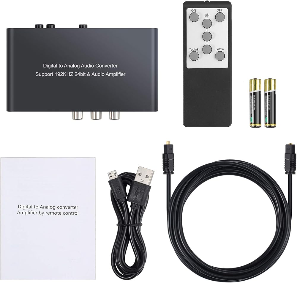 【ماذا يوجد في الصندوق؟ 】1 × محول صوت رقمي إلى تناظري؛ جهاز التحكم عن بعد بالأشعة تحت الحمراء؛ 1 × كابل Toslink (كابل بصري)؛ 1 × كابل يو اس بي؛ 1 × دليل المستخدم.