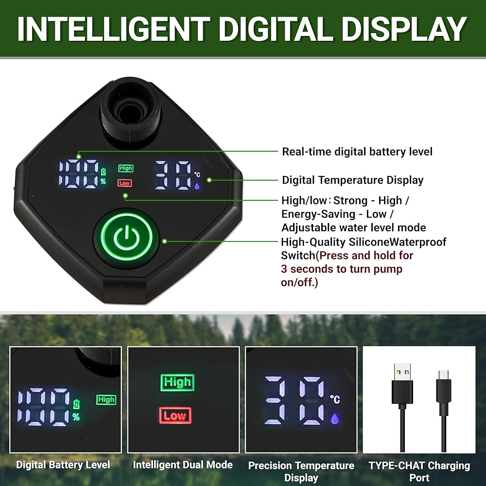 ترقية شاشة LED: توفر شاشة LED لمضخة المياه المحمولة صورة أوضح لحالة الطاقة بالإضافة إلى إشارة سريعة لرقم درجة حرارة الماء، النطاق المطبق من 32-140 درجة فهرنهايت، شاشة مضخة دش التخييم تسمح لك بتجنب الحرارة حروق وانقطاع التيار الكهربائي منتصف النهار.