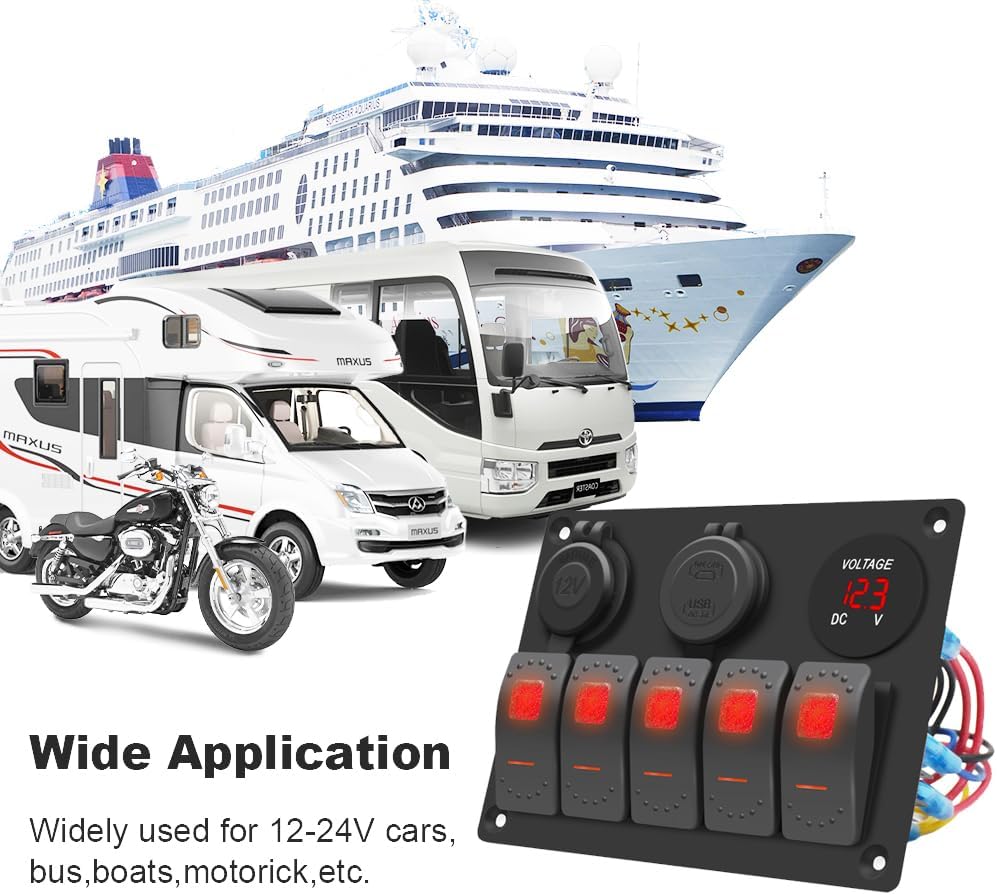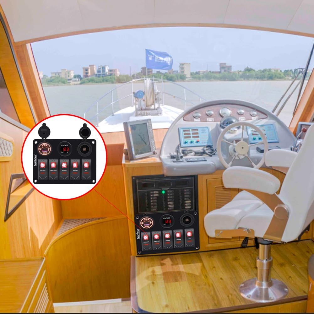 • [مركز تحكم متعدد الوظائف]: استمتع بوظائف محسنة مع لوحة تبديل قارب Garfour. يتميز بمقبس ولاعة سجائر 12 فولت، ومقياس فولتميتر 12 فولت، وإمدادات طاقة USB مزدوجة 5 فولت 3.1 أمبير، فهو الحل الشامل لاحتياجات الطاقة والمراقبة.