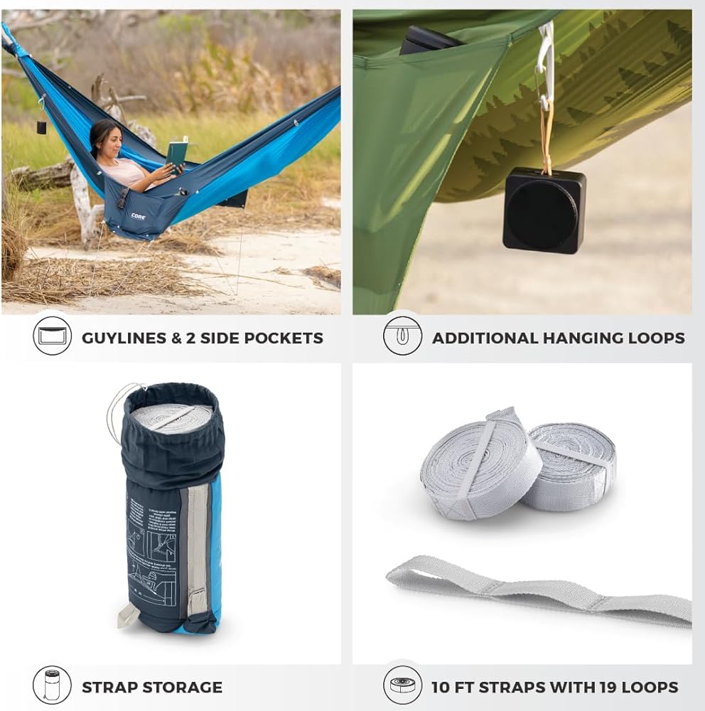 ميزات التخزين: سواء كنت في عمق البرية أو تتسكع في الفناء الخلفي الخاص بك، فإن ميزات أرجوحة المظلة هذه ستعزز تجربتك: 14 حلقة منسوجة لربط أساسيات التخييم الخاصة بك وجيب جانبي مدمج للحفاظ على الأشياء الشخصية في متناول اليد بسهولة. .