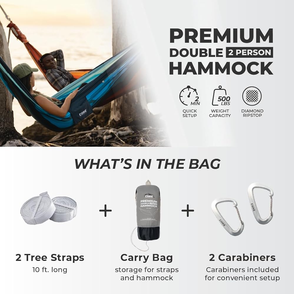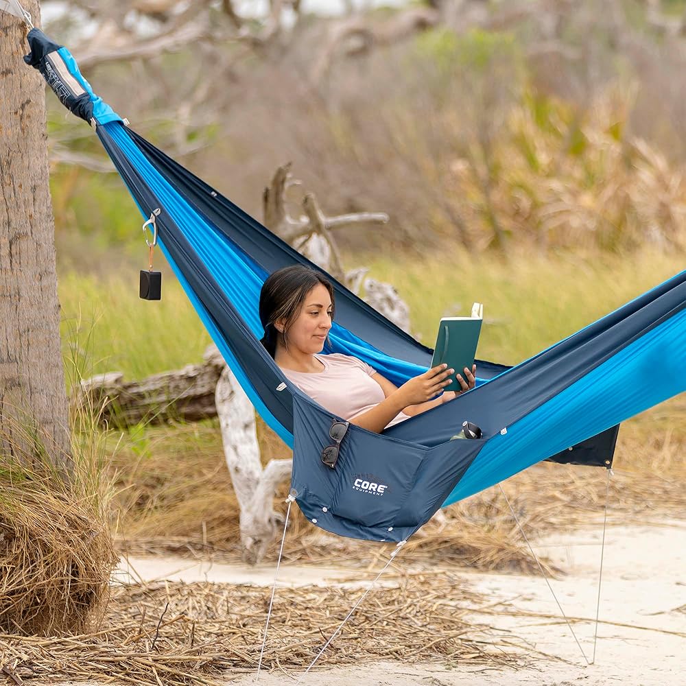 سعة مزدوجة متينة: مصنوعة من نسيج النايلون المقاوم للتمزق الماسي 300 خيط 40D، تم تصميم الأرجوحة CORE لشخصين لدعم ما يصل إلى 500 رطل. هذه المادة القوية عالية الجودة تجعلها مرنة بما يكفي لتكون أرجوحة شجرة خارجية موثوقة.