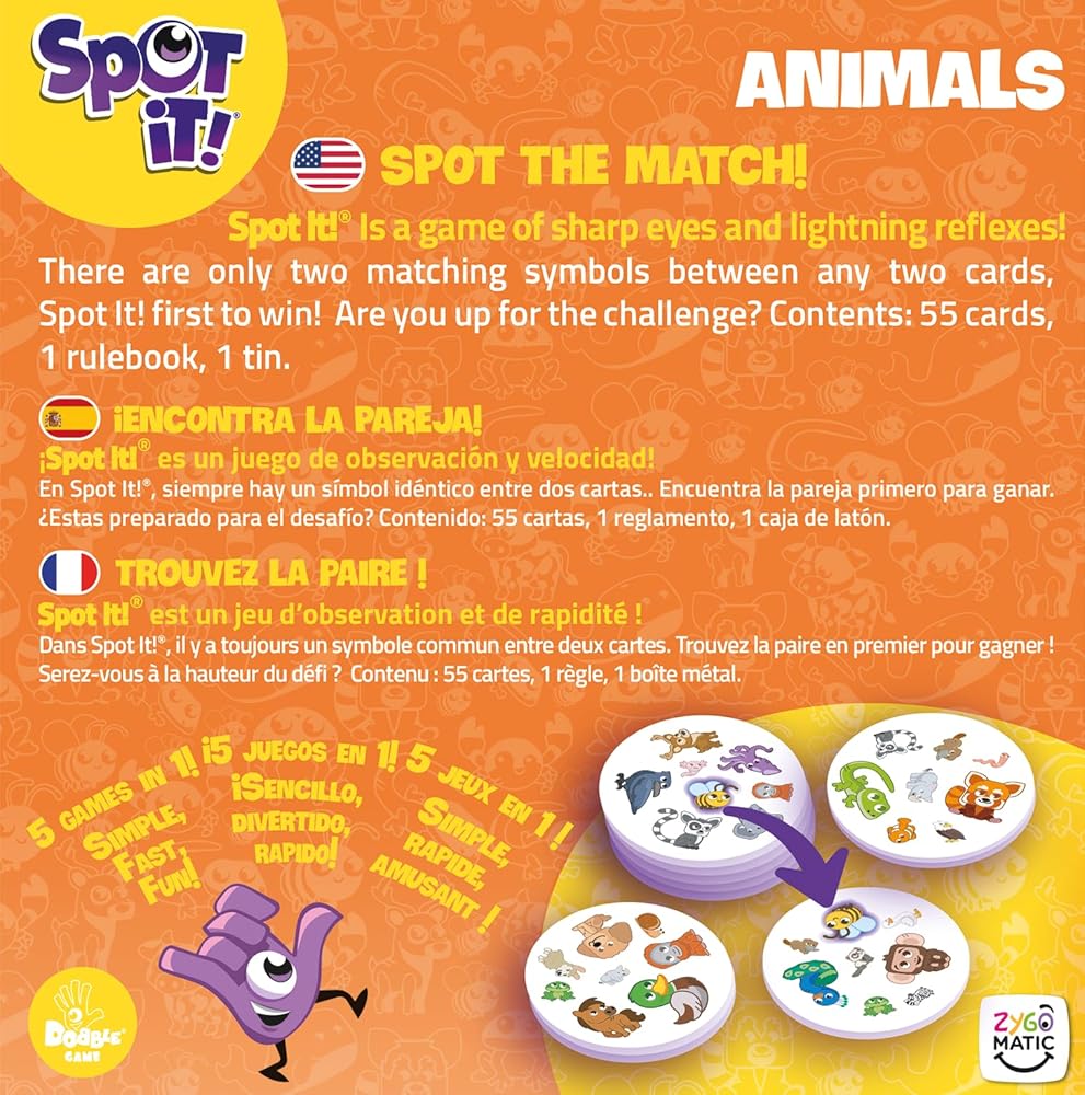 - موضوع الحيوان الحصري: انغمس في نسخة حصرية ذات طابع حيواني من Spot It! مصممة لتأسر وترفيه اللاعبين الصغار.
