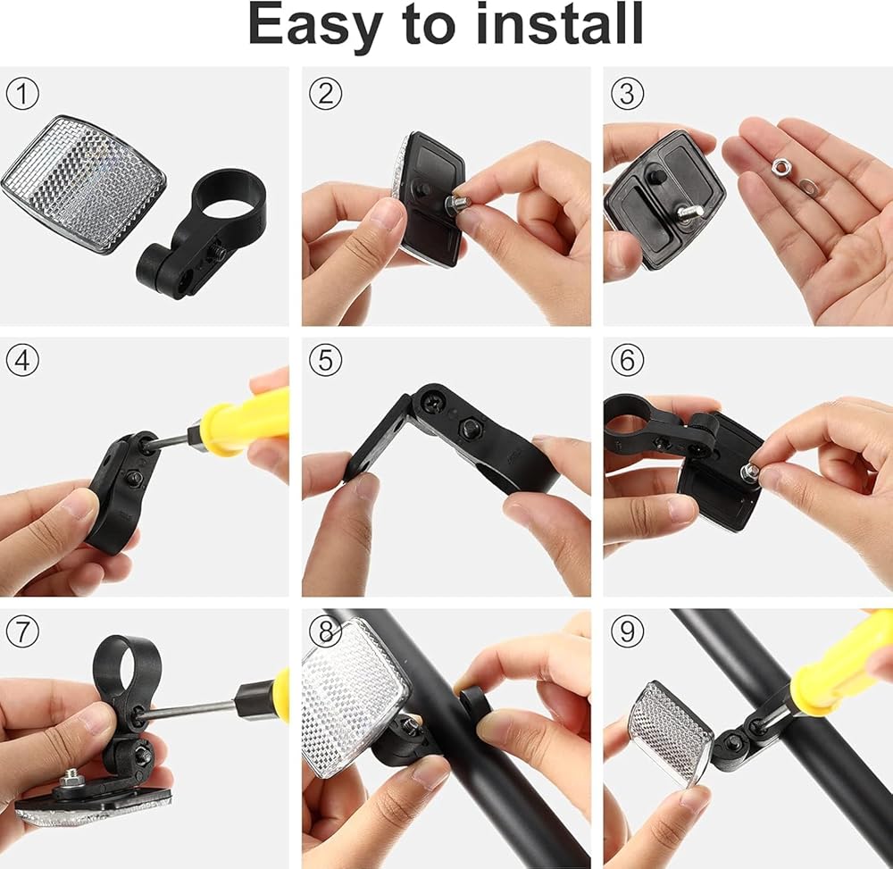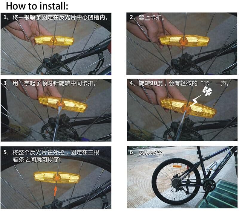 تركيب مريح: لتثبيت عاكس تحذير سلامة الدراجة لشريط المقبض، تحتاج إلى الحصول على مفك براغي، وفك الصمولة من المسمار وتثبيت العاكسات حيث تريد، على شريط المقبض أو أسفل حامل السرج؛ يمكن تركيب عاكسات العجلات البيضاء بشكل أسهل نظرًا لعدم الحاجة إلى أدوات