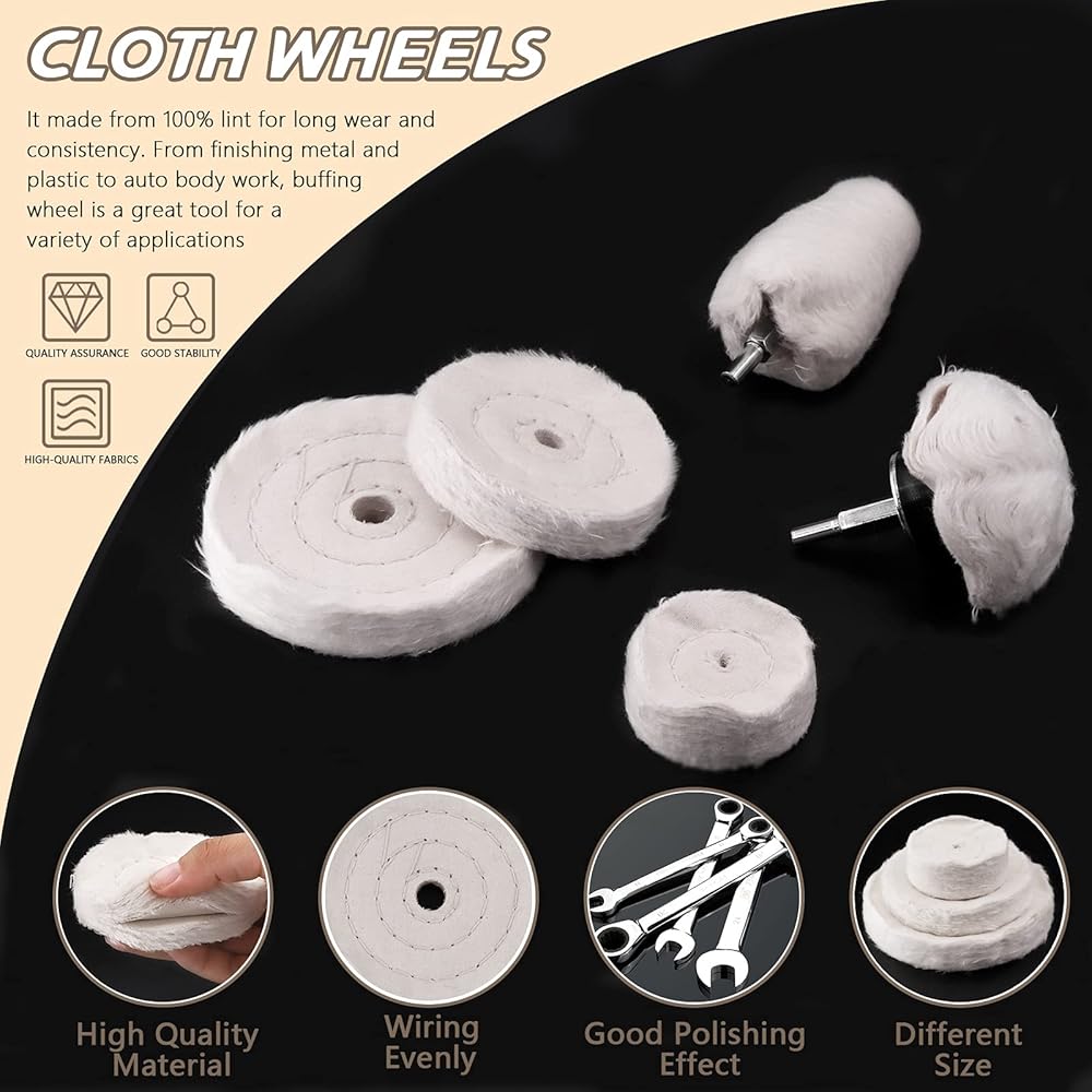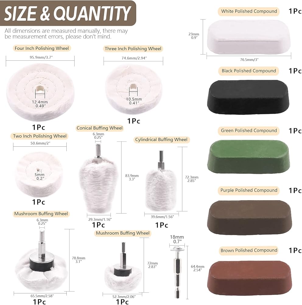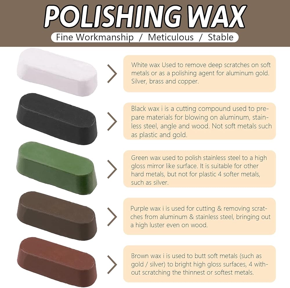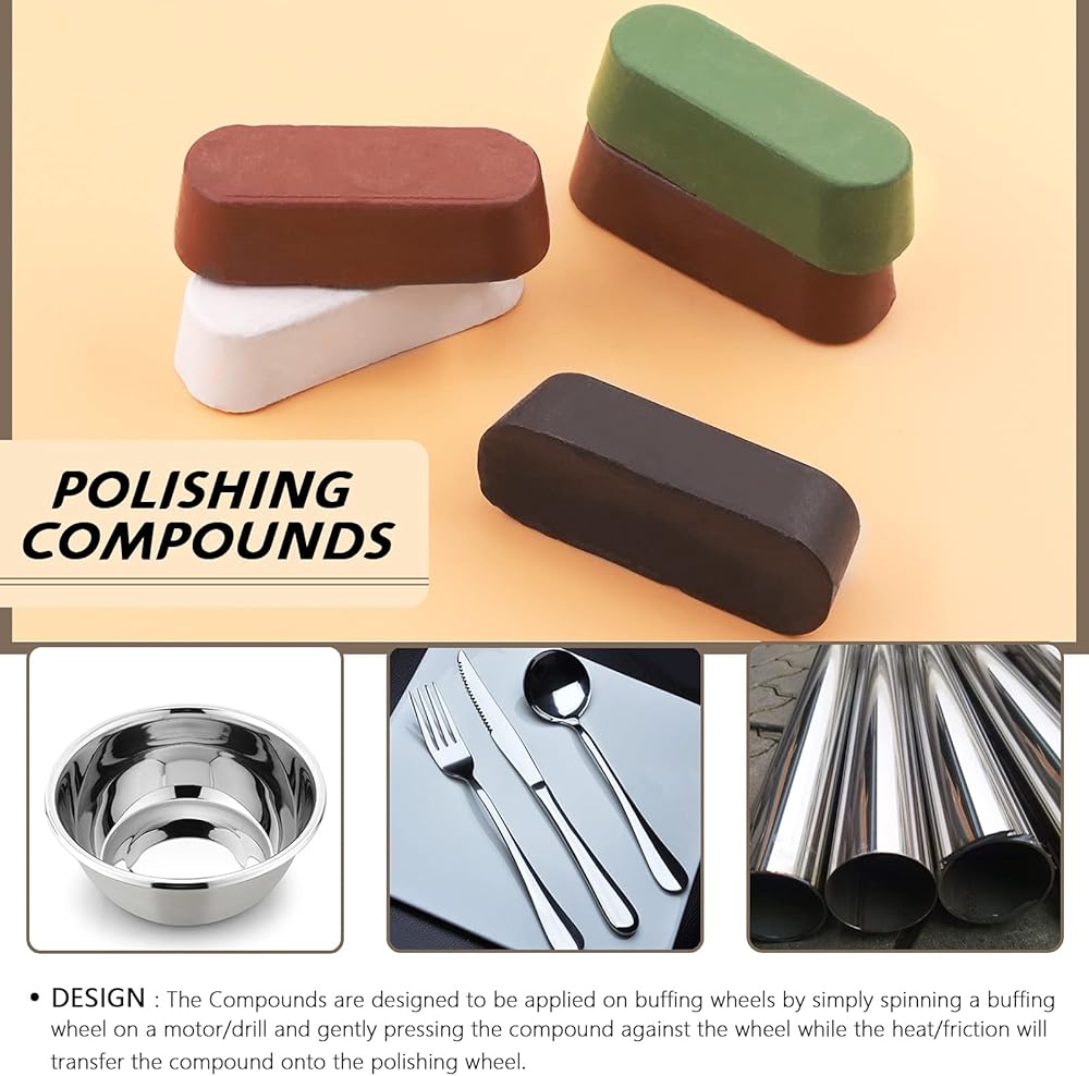 ★ مع 5 قطع من مركبات التلميع بألوان مختلفة ------ تم تصميم المركبات ليتم تطبيقها على عجلات التلميع ببساطة عن طريق تدوير عجلة التلميع على محرك/مثقاب والضغط بلطف على المركب على العجلة بينما ستنقل الحرارة/الاحتكاك مركب على عجلة التلميع.
