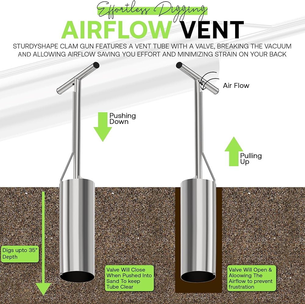 الفتحة: لسهولة السحب وتحسين الكفاءة، يتميز SturdyShape Clam Gun بأنبوب تهوية مع صمام، مما يكسر المكنسة الكهربائية ويسمح بتدفق الهواء، مما يوفر جهدك ويقلل الضغط على ظهرك.