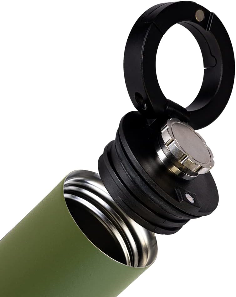 جاهزة دائمًا للانطلاق: حلقة معدنية قابلة للطي مع إغلاق مغناطيسي تجعل من السهل ربط هذه القارورة بأي حقيبة، لذلك يمكنك دائمًا تناول مشروبك المفضل في الهواء الطلق.