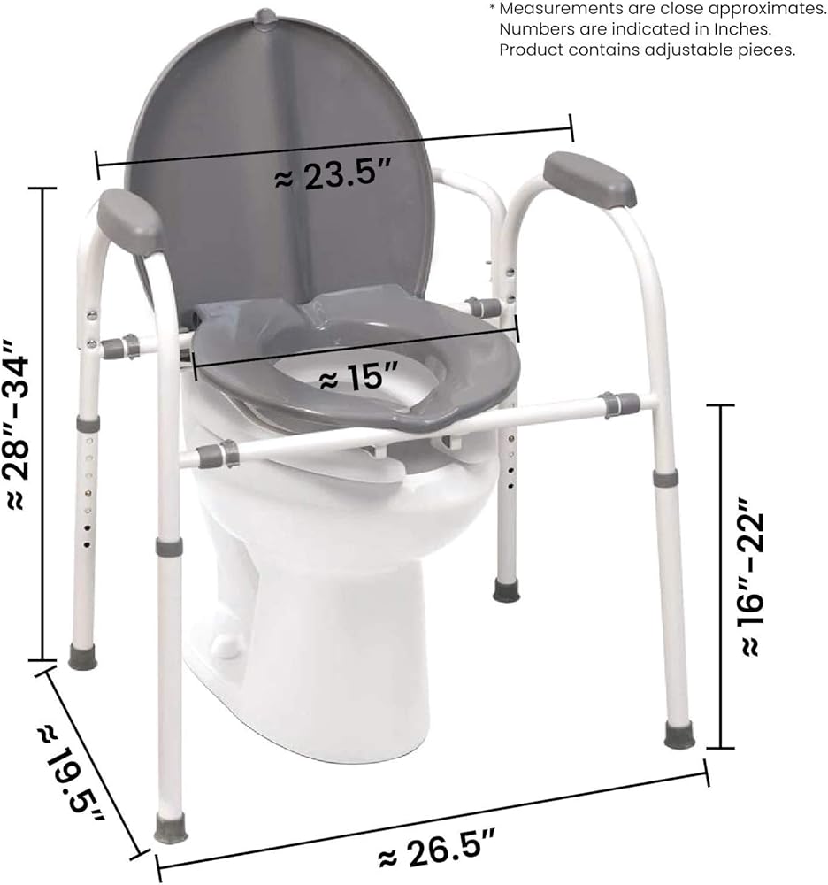 إطار قابل للتعديل: إطار فولاذي قوي ومتين يتميز بـ 7 إعدادات قابلة للتعديل تتراوح من 16 بوصة إلى 22 بوصة من الأرض إلى المقعد. التجميع بدون أدوات يجعل من السهل تجميع مقعدك في دقائق. نحن نضع راحتك في الاعتبار من خلال بديل أكثر أمانًا للمرحاض مع خيارات قابلة للتعديل.