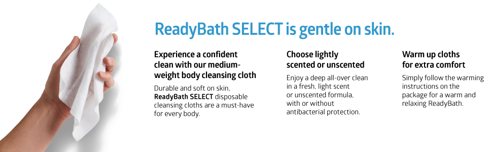 Ready Bath Select Wipes are pre-moistened with gentle, rinse-free cleansers plus soothing, moisturizing skin conditioners