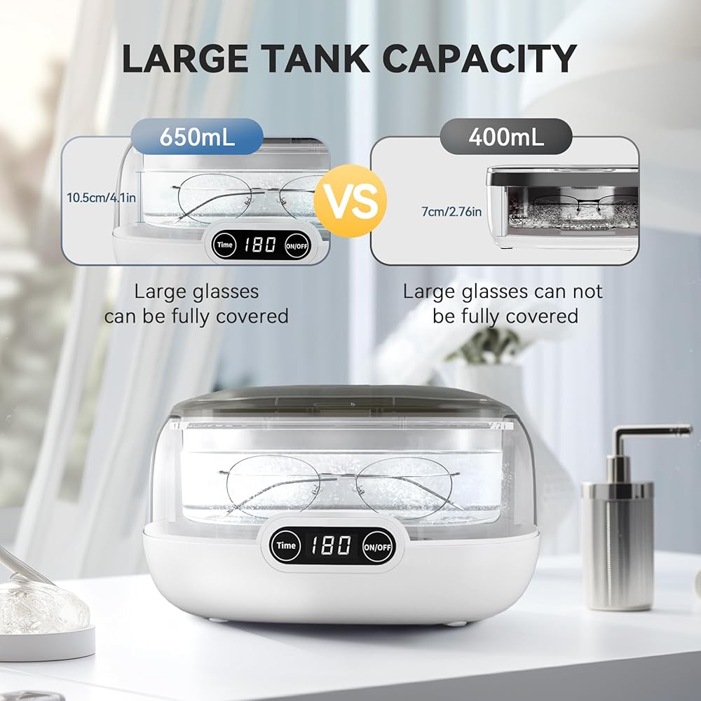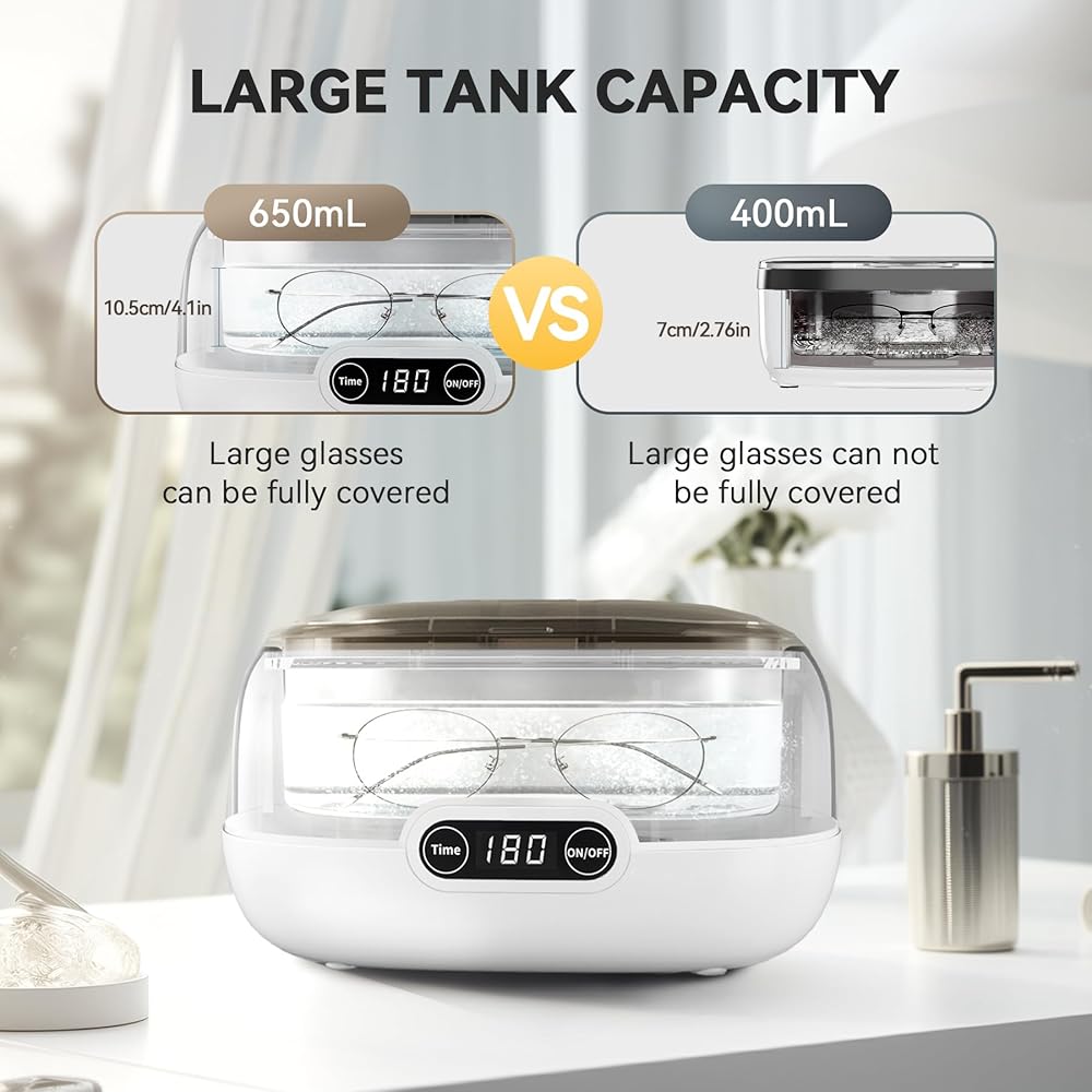【سعة كبيرة وتخزين مريح】ماكينة تنظيف المجوهرات بالموجات فوق الصوتية بسعة كبيرة 650 مل (22 أونصة)، تضمن وجود مساحة كافية لتنظيف العناصر المختلفة أو النظارات الكبيرة في وقت واحد، مما يوفر الوقت والجهد. نصيحة: يعمل بشكل جيد مع حلول التنظيف أو المنظفات. يتناسب منظف النظارات بالموجات فوق الصوتية جيدًا على سطح الطاولة ومنضدة الحمام ويتم تعبئته بسهولة ودقة للتخزين. لا تشغل مساحة كبيرة على المنضدة.