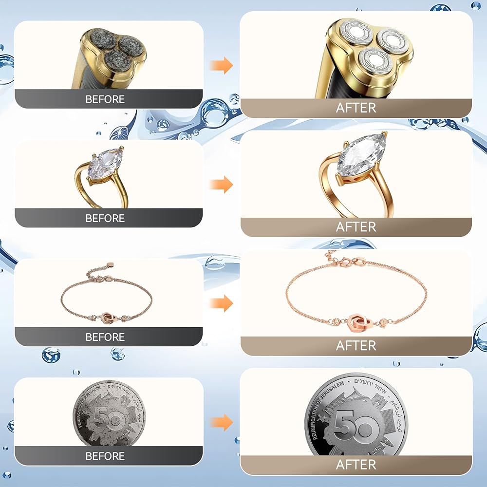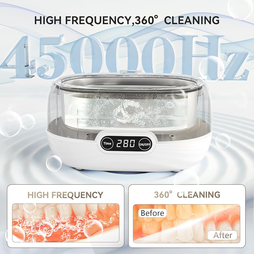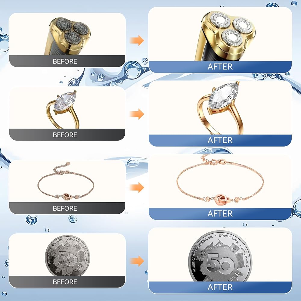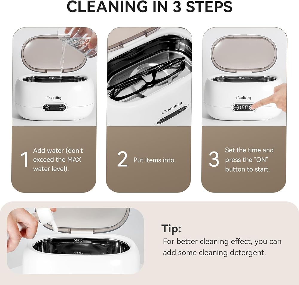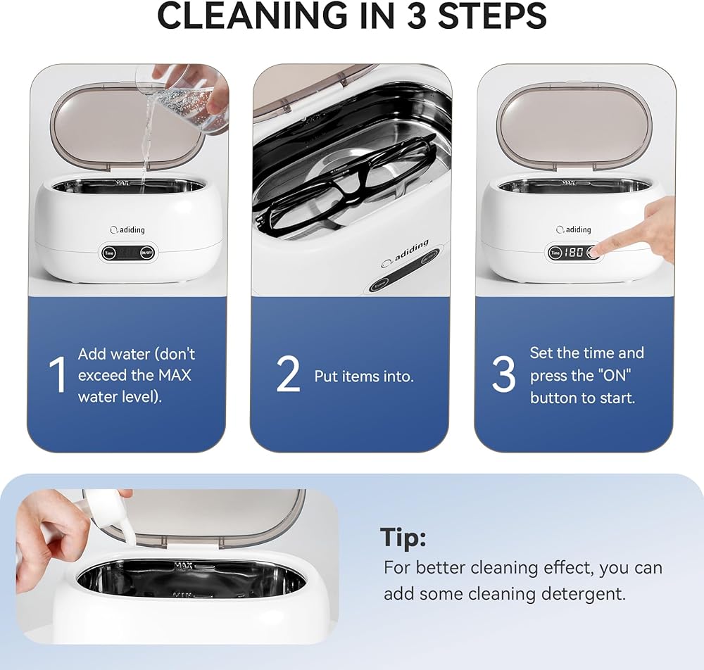 【تنظيف شامل بزاوية 360 درجة】يستخدم المنظف بالموجات فوق الصوتية بقوة 35 وات موجات فوق صوتية 45 كيلو هرتز لتوليد فقاعات صغيرة لا حصر لها تخترق أصغر المساحات لرفع الأوساخ والأوساخ. احصل على تنظيف شامل بزاوية 360 درجة دون الحاجة إلى تنظيف قوي باستخدام فرشاة. ملحوظة: غير مناسب لتنظيف النظارات الشمسية الطبية أو النظارات ذات الطلاء أو الخدوش. آلة التنظيف الصوتية هذه غير قادرة على تلميع المجوهرات الفضية التي تتأكسد وتشوه.