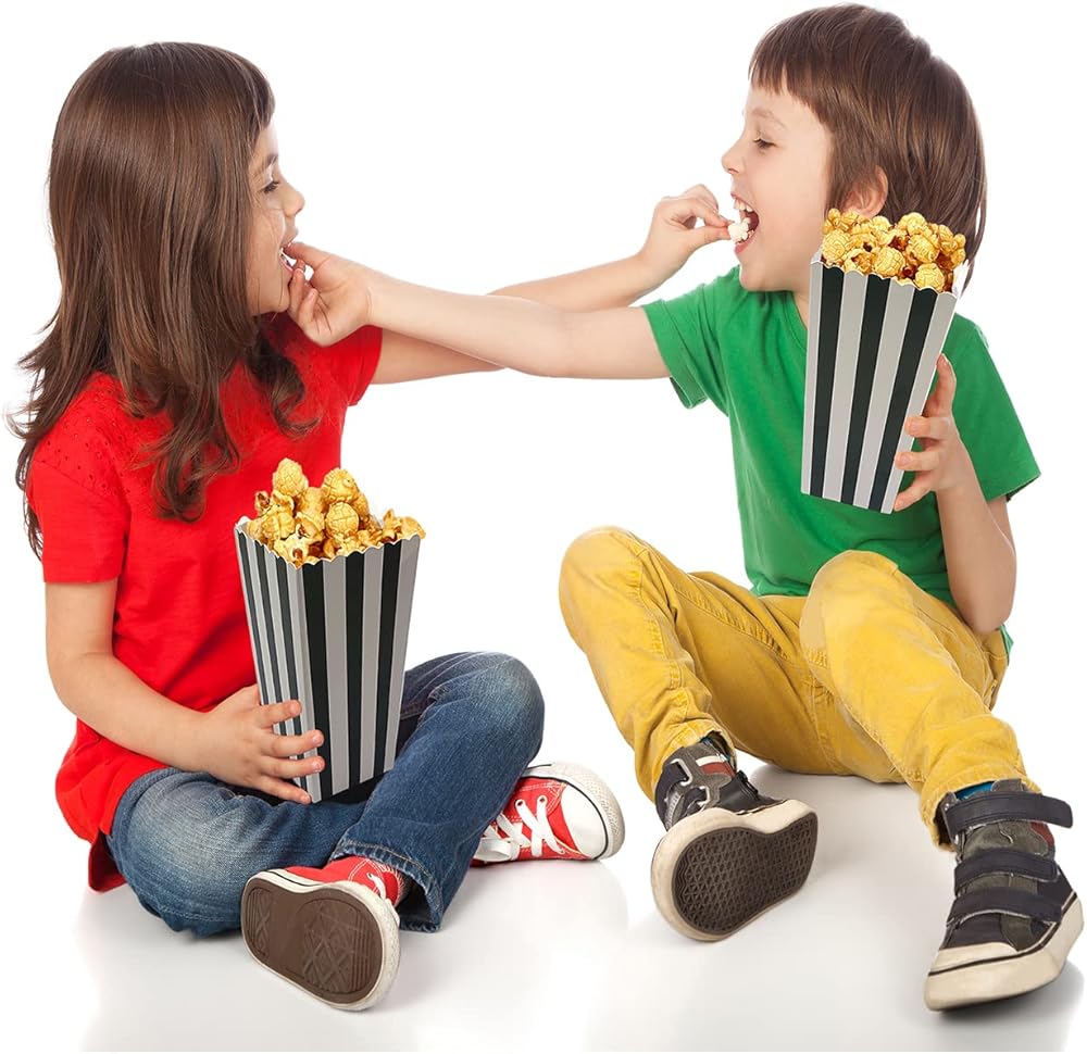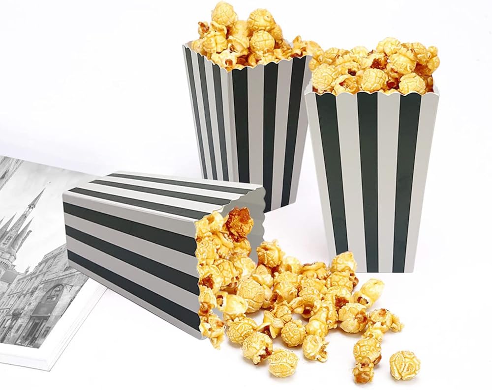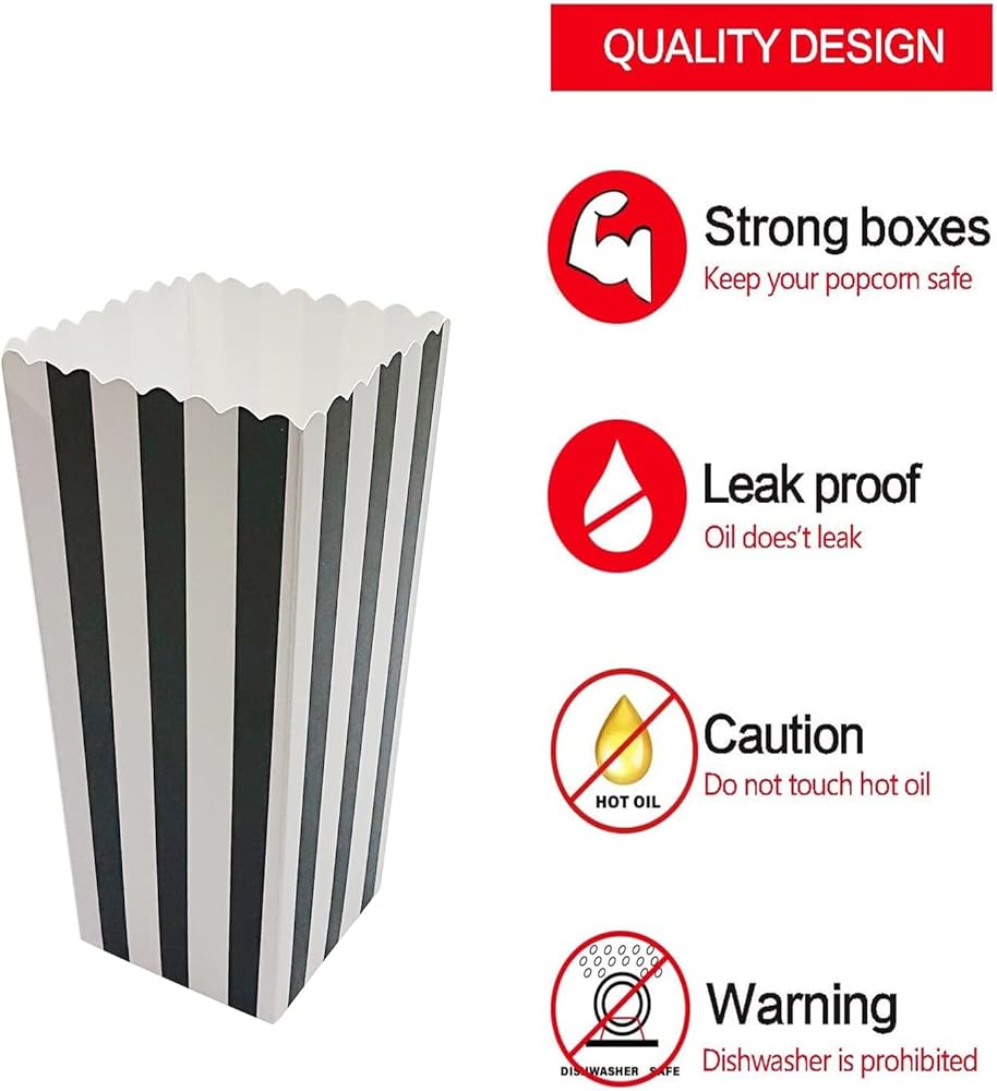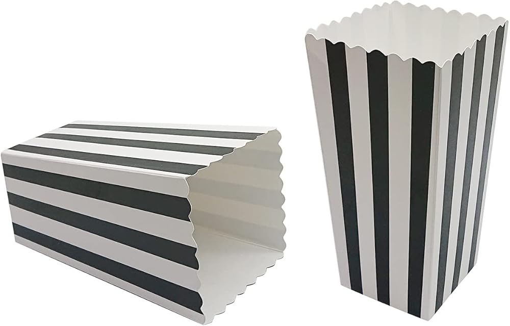 • صناديق الفشار باللونين الأسود والأبيض عالية الجودة: مصنوعة من ورق عالي الجودة، آمنة ومتينة.