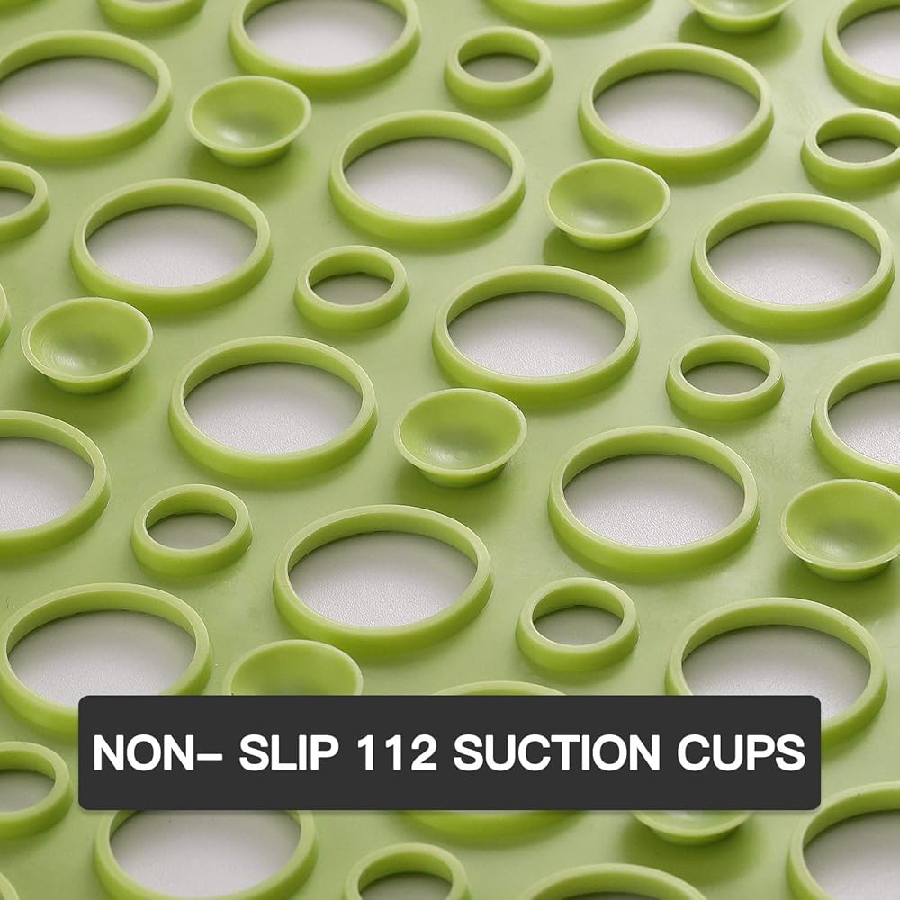 • Non-Slip Shower Mats with Hundreds of Suction Cups,Holes, Rapid Drainage: Our bath and shower safety mats feature 112 soft suction cups that help hold in place on smooth, clean surfaces.202 drainage holes provide fast water run off, resists the growth of stain and odor-causing on the tub mat, also repels soap residues which can cause slips, no smell and healthy for you.