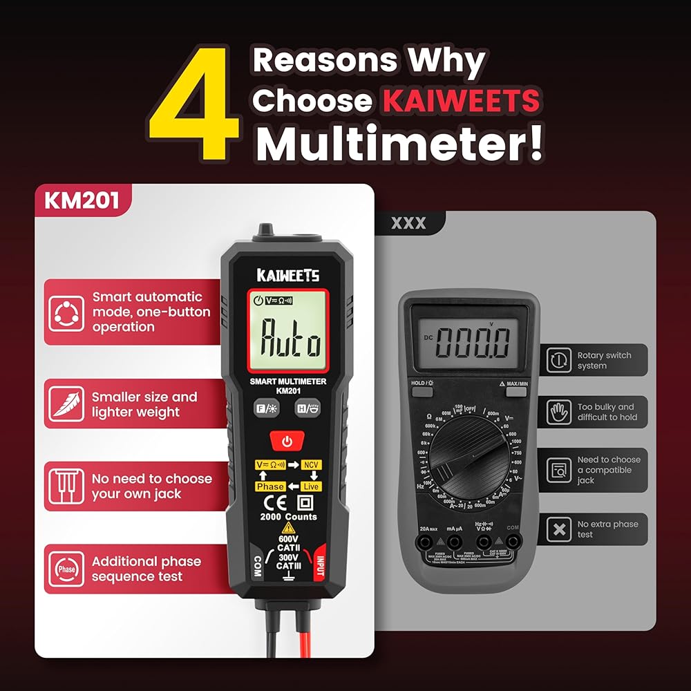 KAIWEETS Smart Multimeter TRMS 2000 Counts، الفولتميتر مع NCV يقيس جهد التيار المتردد DC، المقاومة، الاستمرارية، المرحلة، جهاز اختبار الجهد الكهربائي المحمول مع حامل يؤدي للمنزل، اختبار ورشة العمل