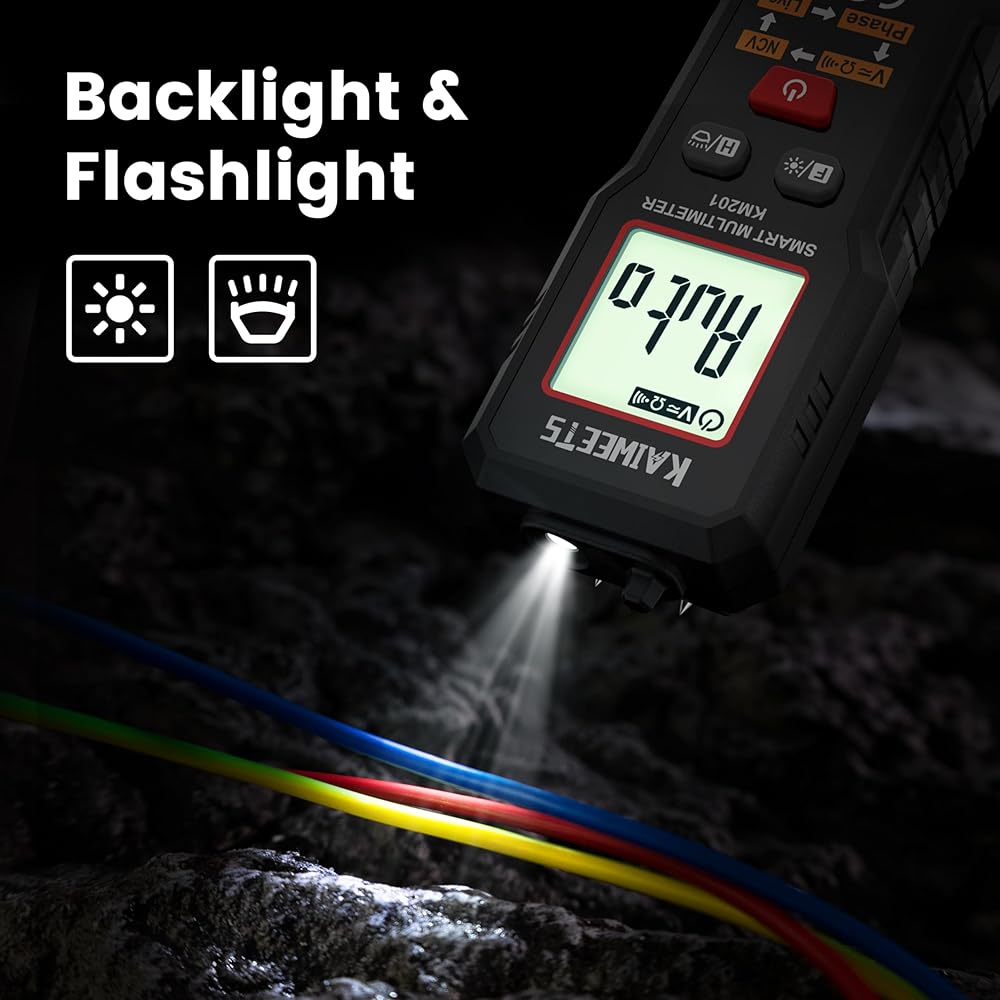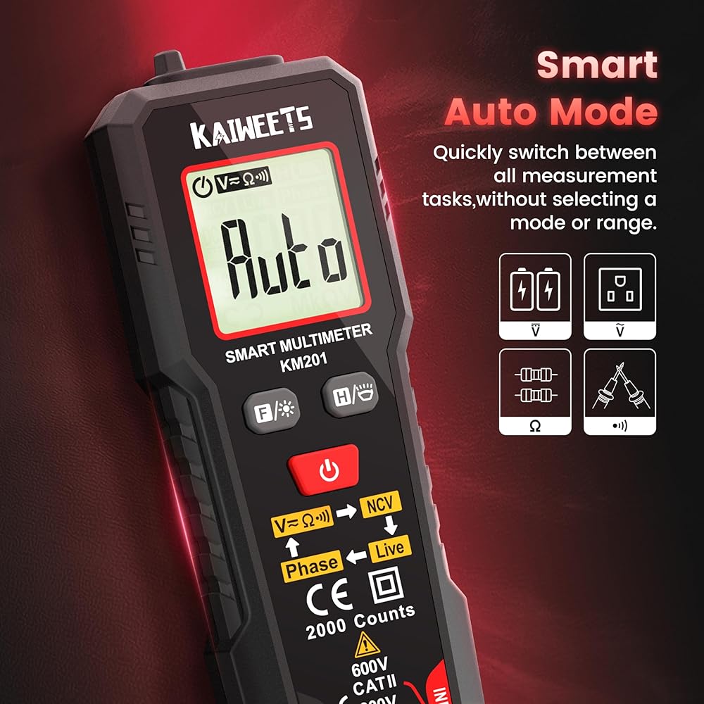 【الوضع الذكي 】 لا حاجة لتحديد الوضع والنطاق بعد الآن. يمكن لجهاز اختبار المتر المتعدد الذكي KAIWEETS KM201 تحديد محتوى القياس واختيار أفضل نطاق دقة لضمان نتائج قياس دقيقة وموثوقة.
