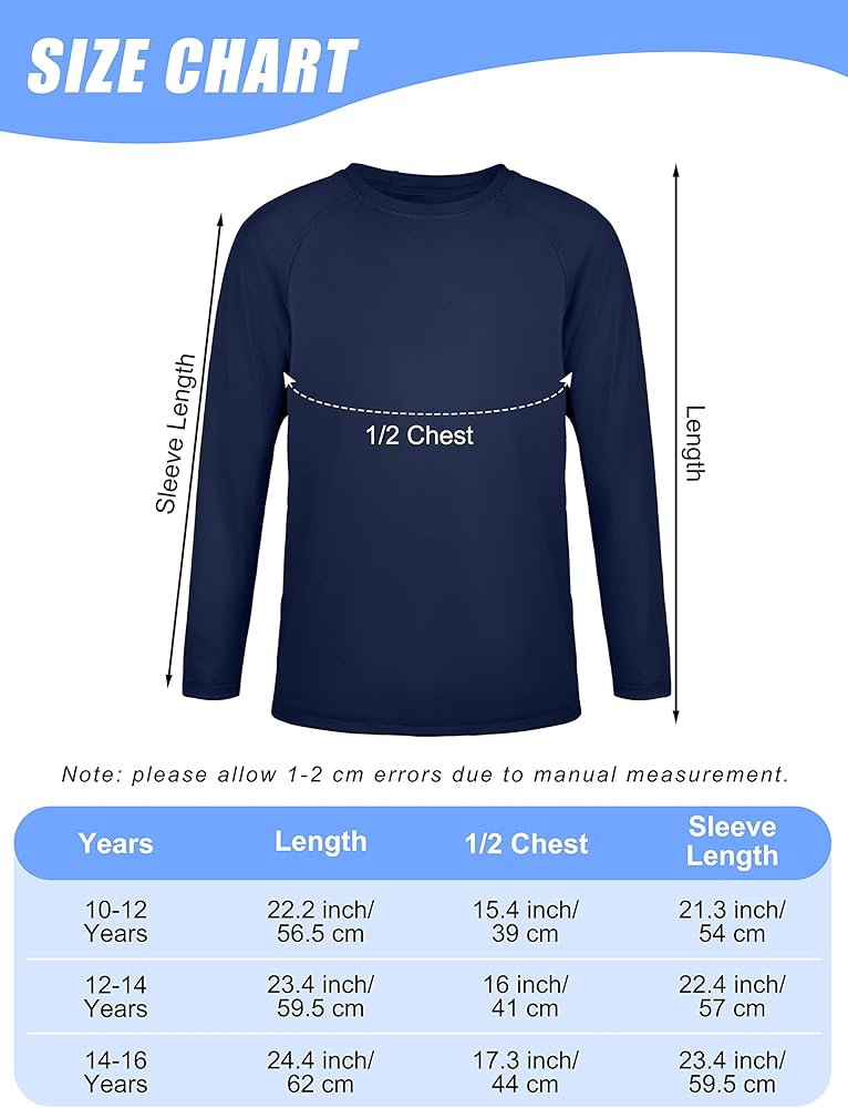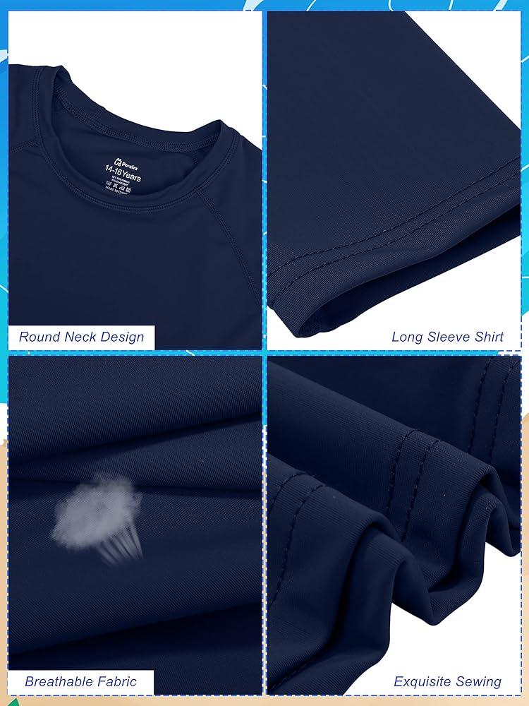 حماية سريعة الجفاف والشمس: مصنوعة من 84% بولي أميد و16% ألياف لدنة، هذه القمصان الواقية من الشمس سريعة الجفاف للأولاد تتمتع بحماية من الشمس بعامل حماية من الشمس 50+ لحماية طفلك بشكل فعال من الأشعة الضارة؛ يجف القماش بسرعة ويمكن تجفيفه بالهواء بسهولة أو تجفيفه بالمجفف