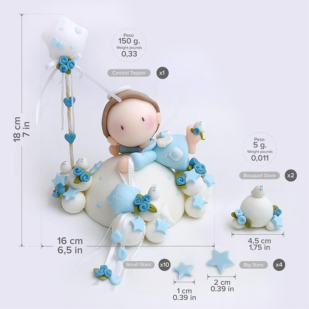 Each set of cake ornaments includes a 6.5x7” angel and pole star centerpiece, two 1.77” bouquet doves, four 0.78” big stars, and 0.39” small stars. They come in charming pastel blue and white colors that are perfect for baby showers and gender reveal parties. They're also ideal for your little one's baptism, christening, or birthday.