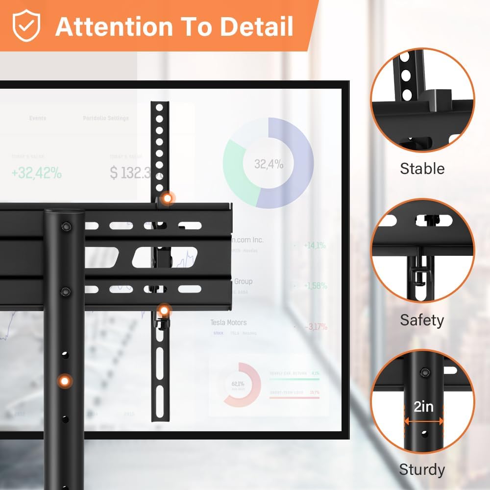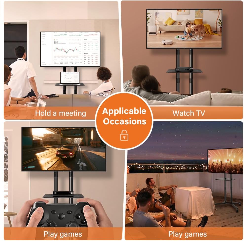 حامل تلفزيون عالمي متدحرج: يناسب حامل التلفزيون المحمول هذا معظم أجهزة التلفزيون المسطحة أو المنحنية مقاس 32 بوصة - 85 بوصة، ويتوافق مع معايير VESA بين 100 × 100 مم إلى 600 × 400 مم، ويتحمل ما يصل إلى 110 رطل.