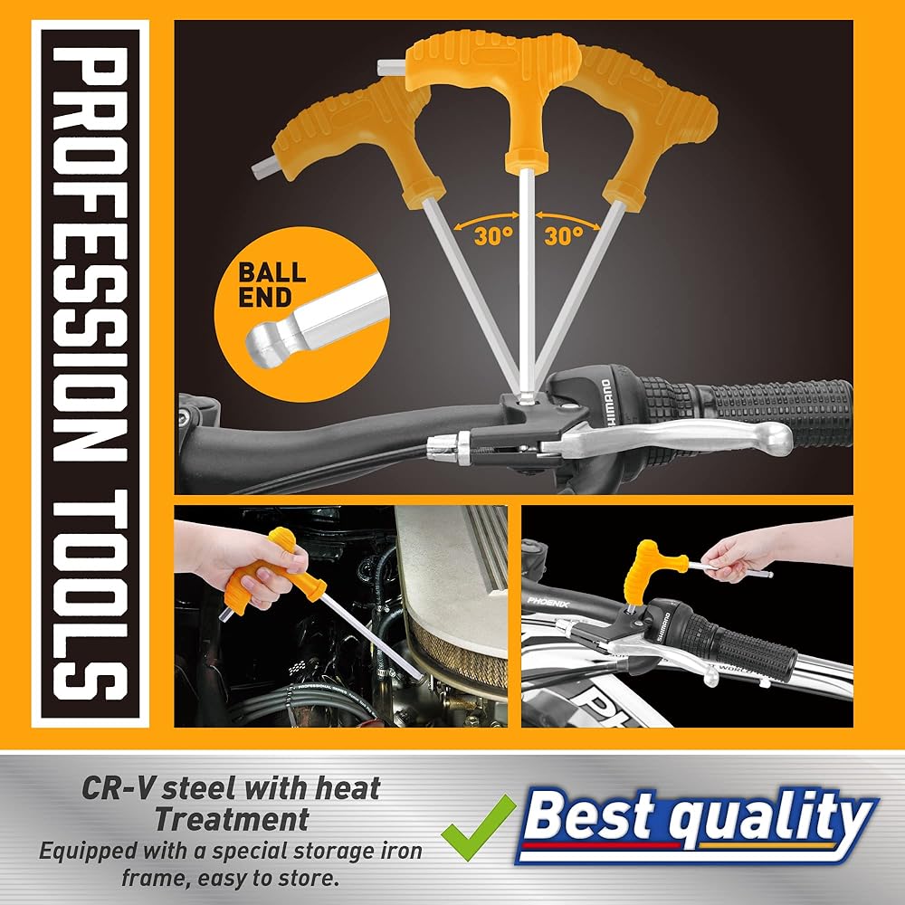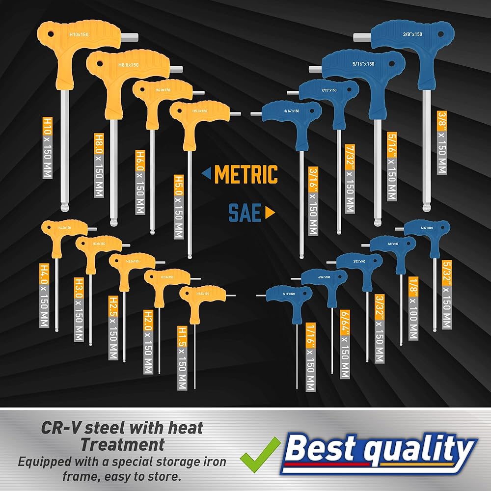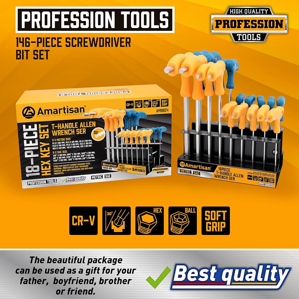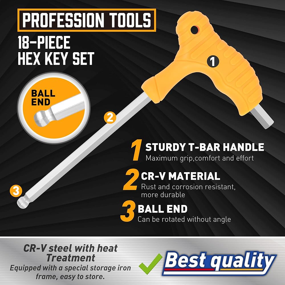 مجموعة مفاتيح ألين بمقبض على شكل حرف T مكونة من 18 قطعة من أمارتيسان، متري (1.5 مم - 10 مم) وSAE (1/16 بوصة - 3/8 بوصة)، مجموعة مفاتيح ربط سداسية ذات نهاية كروية طويلة