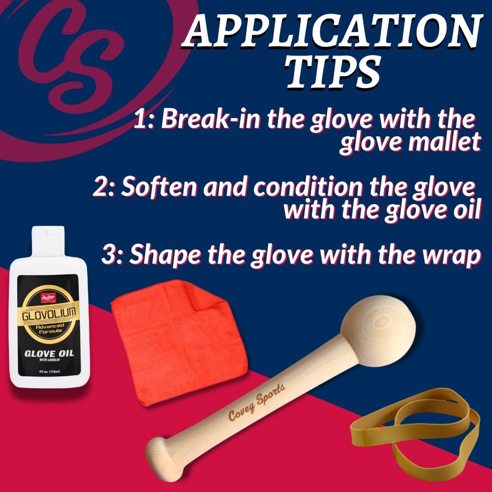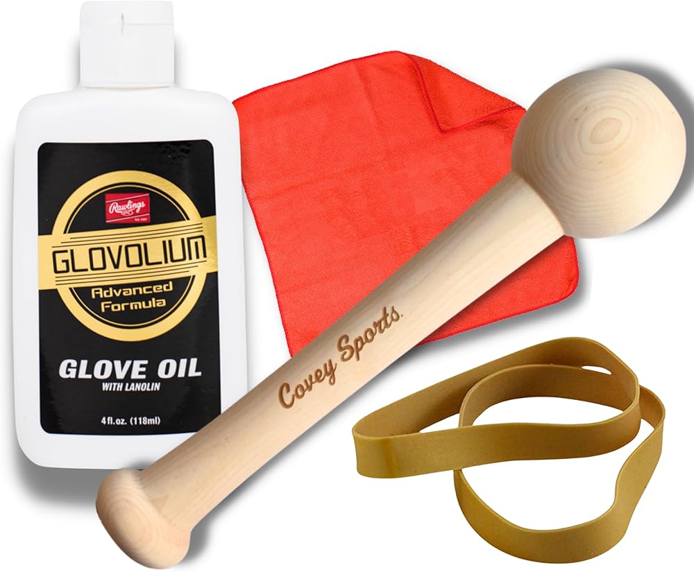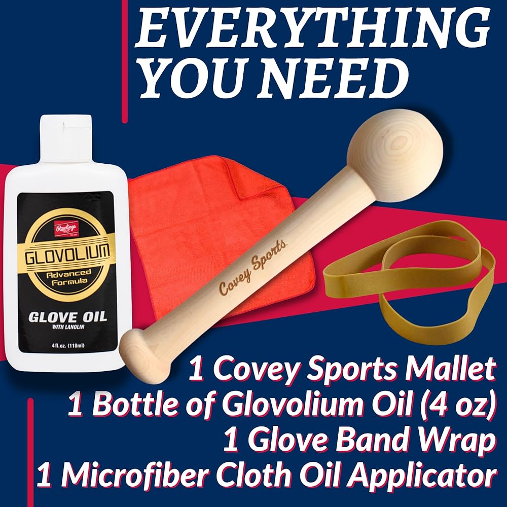 • مجموعة كاملة لكسر البيسبول والكرة اللينة - تتكون كل مجموعة من ملحقات القفازات الجلدية المتعددة؛ تتضمن 1 قفاز رياضي من Covey (طول 11 بوصة)، وزجاجة واحدة من زيت ترطيب قفاز Glovolium، وقطعة قماش من الألياف الدقيقة، و1 لفافة شريط قفاز لحمل شكل القفازات طوال الموسم.
