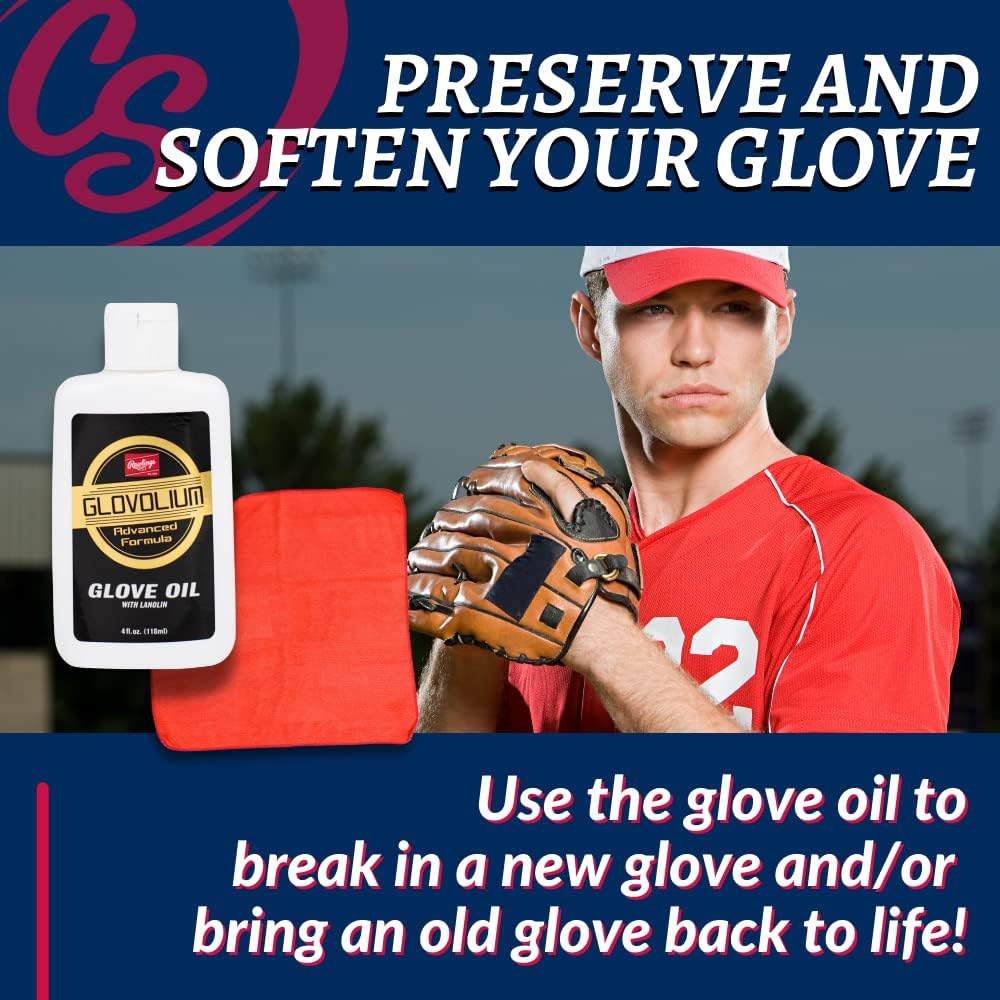 • احصل على لعبة القفازات الخاصة بك جاهزة - استخدم هذه الحزمة لكسر قفاز جديد و/أو الحفاظ على شكل قفازك "القديم" المكسور في البيسبول أو القفاز السريع أو البطيء؛ إن مجموعة ملحقات العناية بالقفازات المكونة من زيت الجلفوليوم (المصنوع من اللانولين)، ومطرقة القفازات، وشريط التغليف، والقماش ستجعل قفازك جاهزًا للعب.