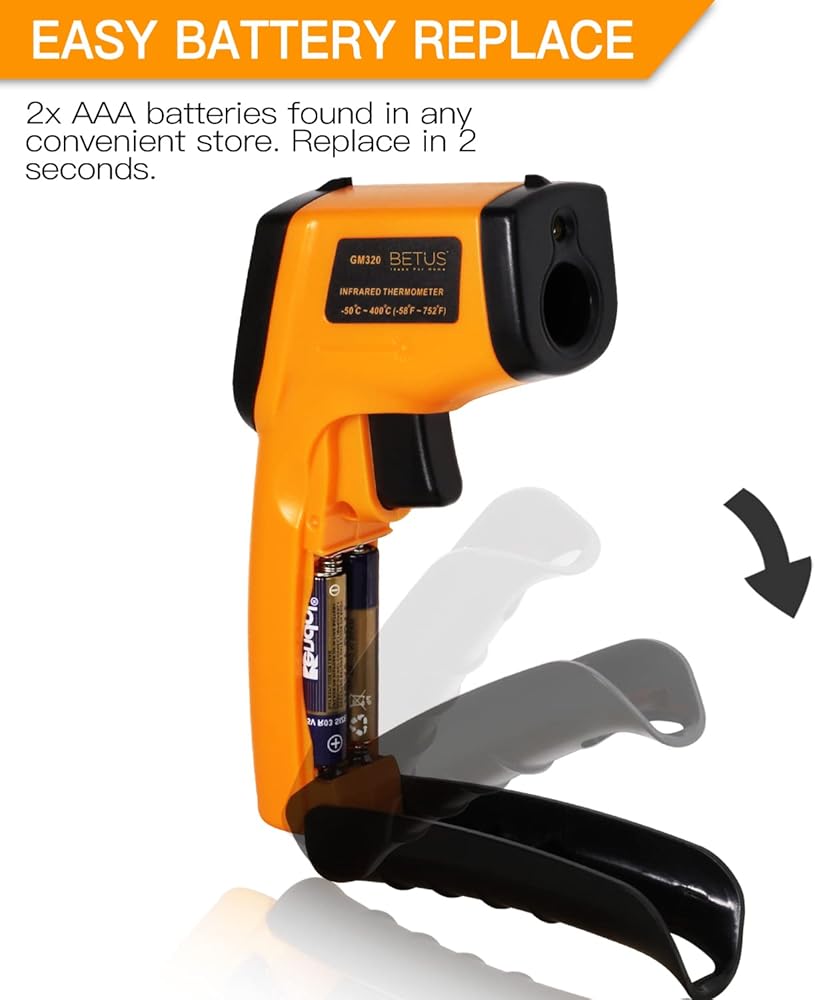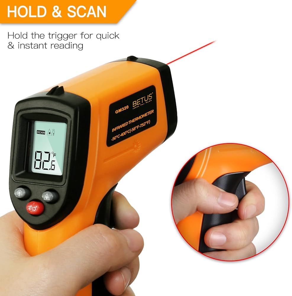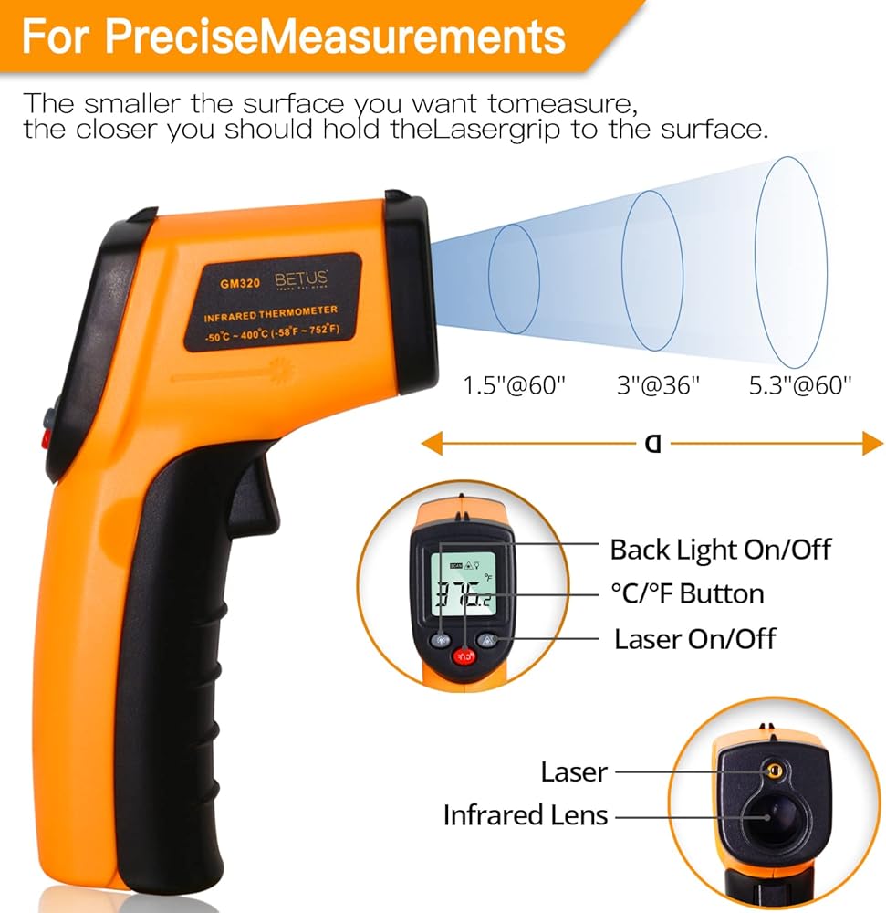 نطاق واسع - مقياس حرارة بيتوس بالأشعة تحت الحمراء لقياس درجة الحرارة من -50 درجة مئوية/-58 درجة فهرنهايت إلى 550 درجة مئوية/1022 درجة فهرنهايت. إنه مسدس حرارة ليزر مفيد وأساسي في المنزل والصناعي لقياس درجة حرارة الشواء ومحرك السيارة والسيارات والمزيد.