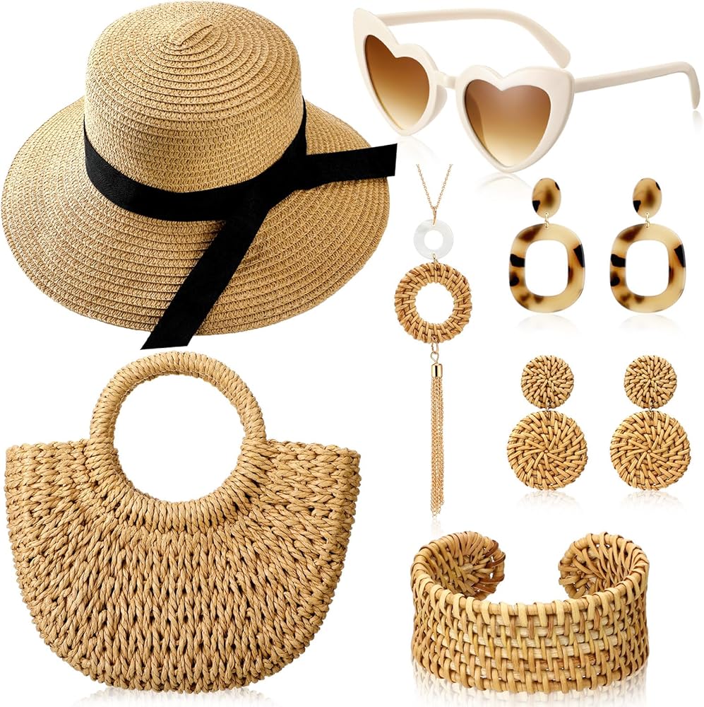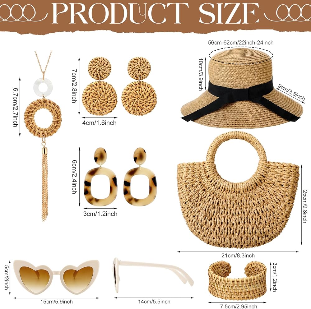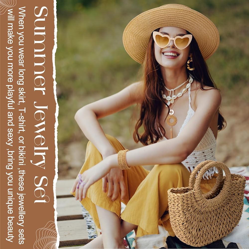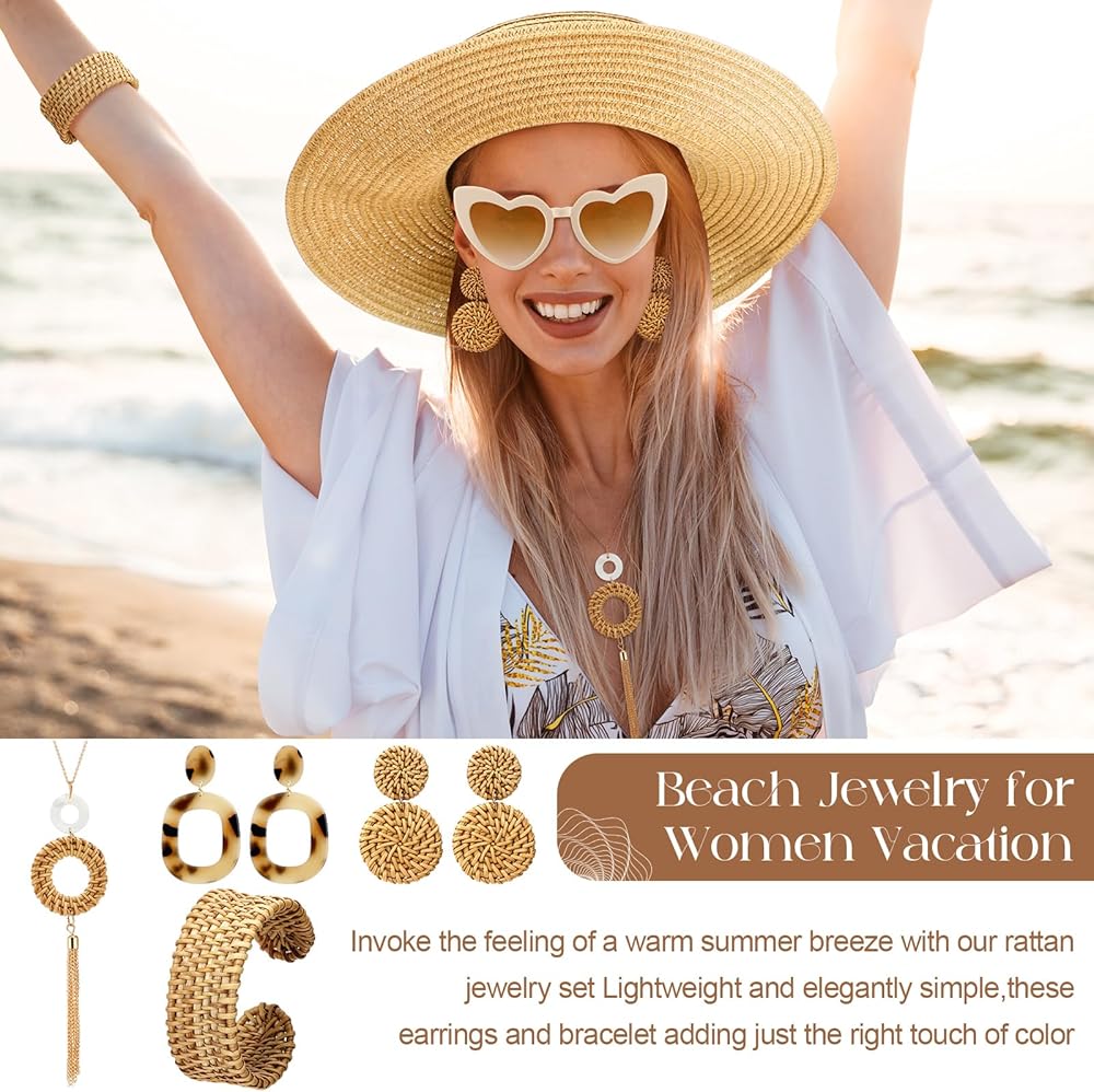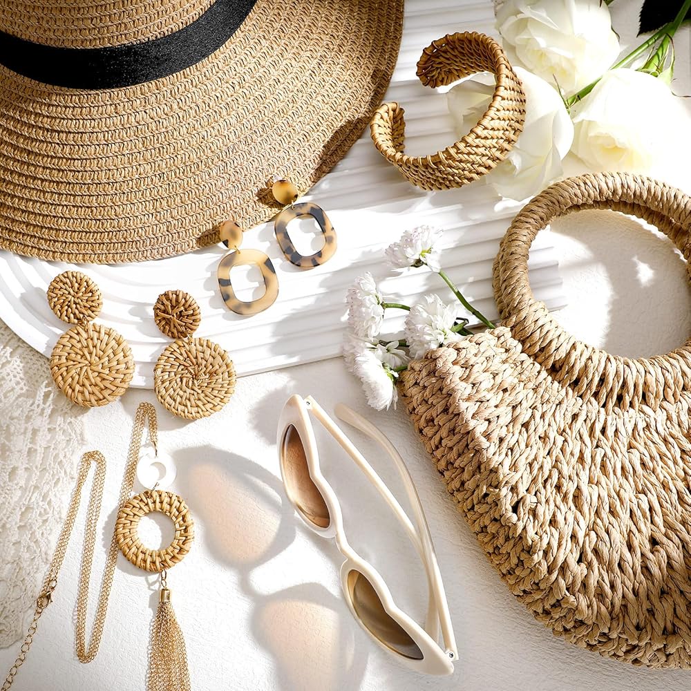مجموعة مجوهرات الروطان الصيفية 7 قطع للنساء لقضاء العطلات من قش الشمس وقبعة الشاطئ ونظارات شمسية صغيرة شبه دائرية من قش الروطان وقلادة طويلة وأقراط الروطان سوار للنساء على الشاطئ بوهيميا