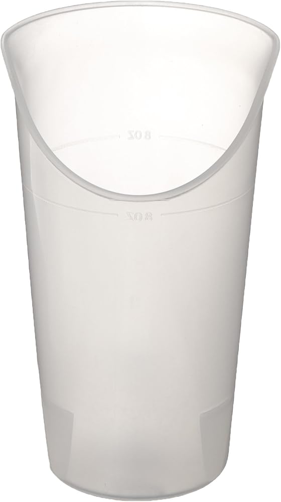 مثالي للأشخاص الذين لديهم قيود على المحرك الفموي، أو نطاق محدود من حركة الرأس، أو الرقبة أو الأطراف العليا المتطرفة، أو التهاب المفاصل. تم تصميم الكوب ليسمح للمستخدم أن يشرب مع مرونة قليلة أو بدون كتف، أو تمديد للمعصم أو حركة الرأس/الرقبة، حتى إذا كان يرتدي طوق عنق عنق. تصميم خاص يوفر مساحة للنظارة. آمنة للاستخدام في غسالة الأطباق. بلاستيك. تحمل 8 أونصات. (237 مل).
