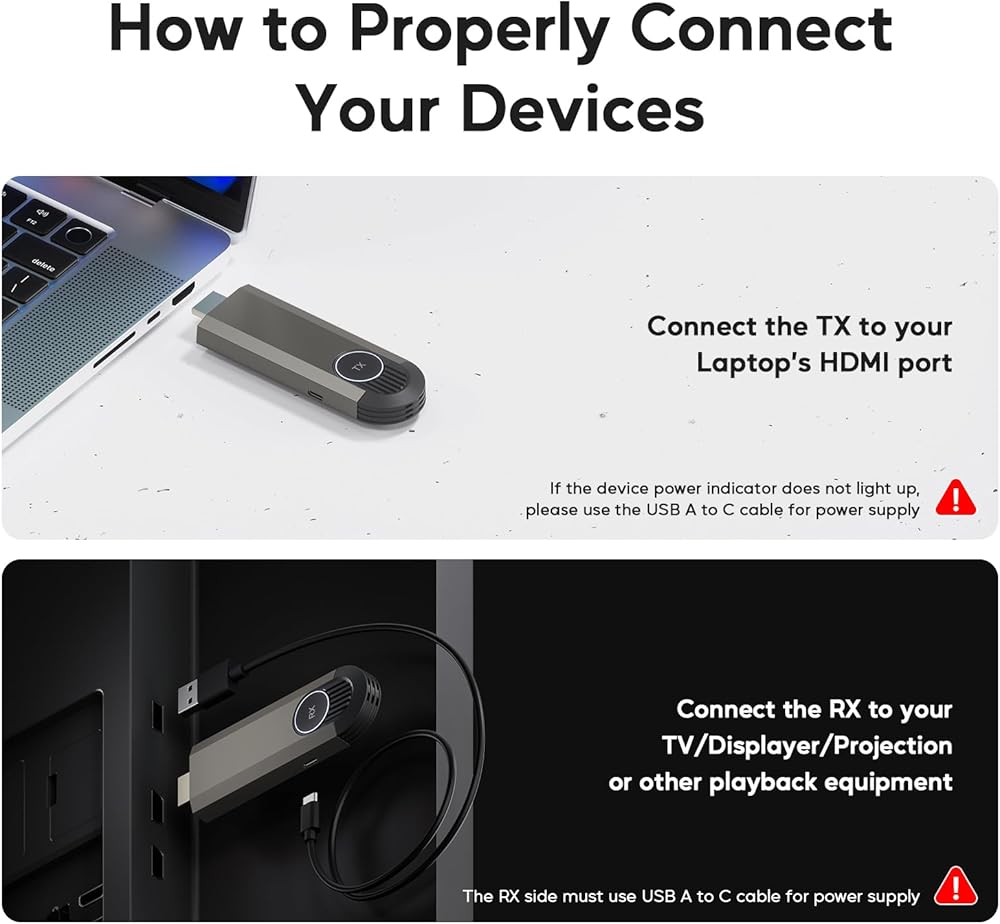 【جهاز إرسال واستقبال HDMI لاسلكي】يرسل جهاز إرسال HDMI اللاسلكي المحتوى لاسلكيًا من جهاز إلى آخر، مع مسافة نقل تصل إلى 98 قدمًا/30 مترًا. تخترق الإشارة القوية الجدران والأرضيات والأسقف بسهولة من أجل اتصال موثوق.