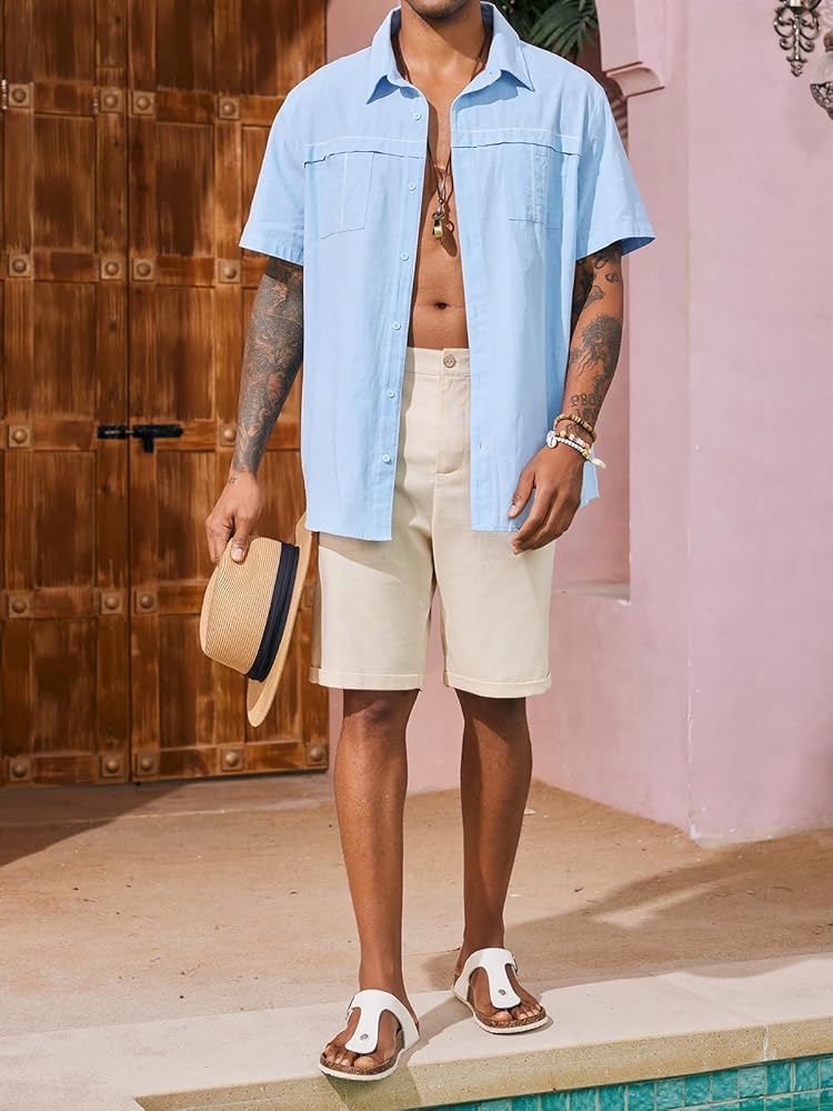 المطابقة: السراويل القصيرة الرجالية هي قطعة متعددة الاستخدامات لخزانة الملابس الصيفية، يمكن ارتداؤها مع تي شيرت لمظهر يومي، أو ارتدي قميص هاواي للمشي على الشاطئ، أو مع قميص من الكتان، بدون أكمام للحصول على مظهر كلاسيكي في الشارع.